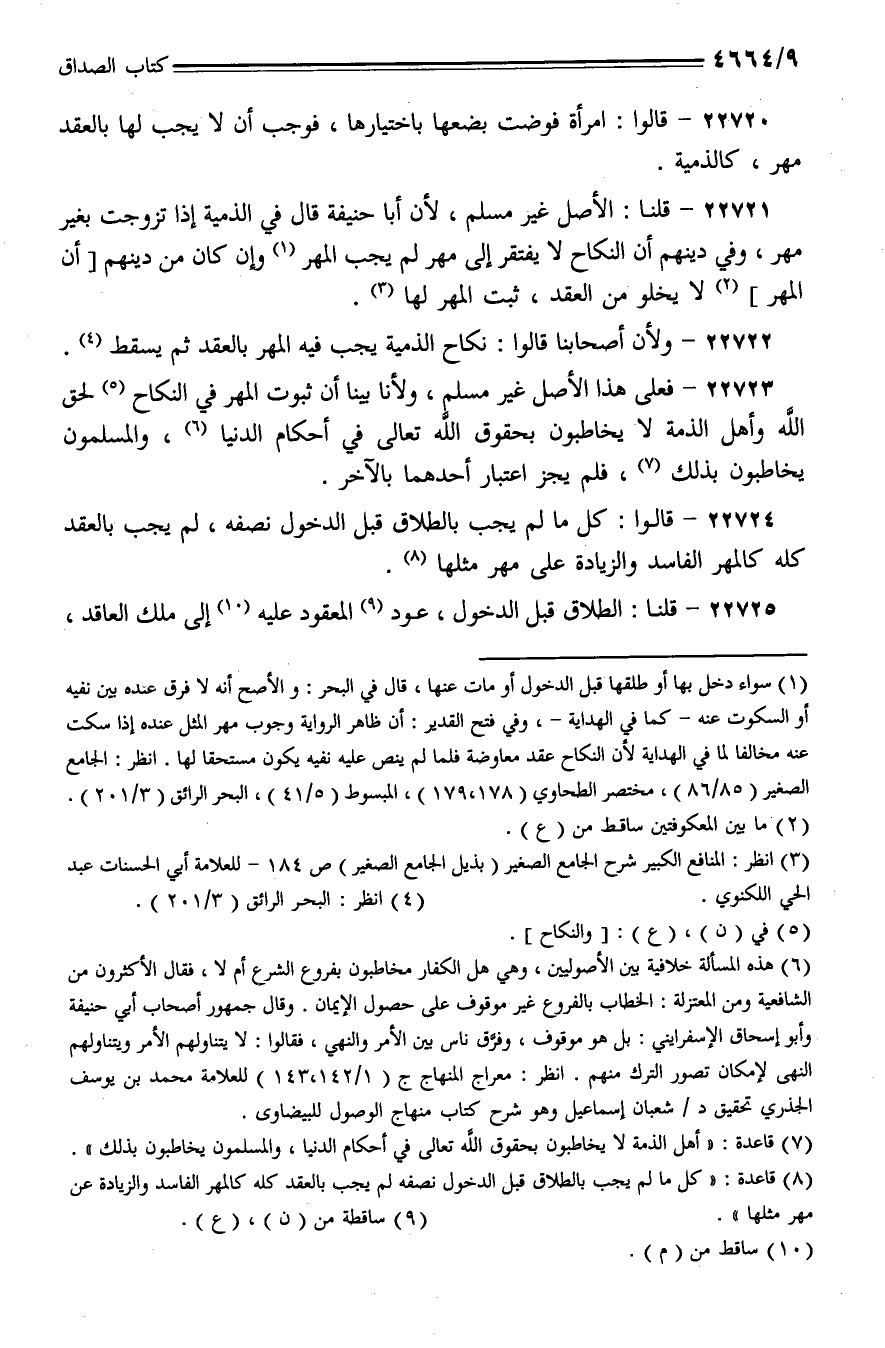22721 - قلنا: الأصل غير مسلم، لأن أبا حنيفة قال في الذمية إذا تزوجت بغير مهر، وفي دينهم أن النكاح لا يفتقر إلى مهر لم يجب المهر وإن كان من دينهم [أن المهر] لا يخلو من العقد، ثبت المهر لها.