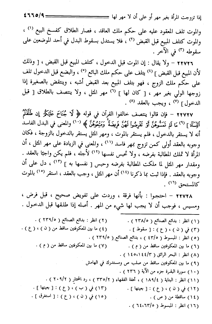 22726 - ولا يقال: إن الموت قبل الدخول، كتلف المبيع قبل القبض، [وذلك لأن المبيع قبل القبض] يتلف على حكم ملك البائع، والبضع قبل الدخول تلف على حكم ملك الزوج، فهو بتلف المبيع بعد القبض أشبه، وينتقض بالصغيرة إذا زوجها الولي بغير مهر، [كان لها] مهر المثل، ولا ينتصف بالطلاق [قبل الدخول]، ويجب بالعقد.