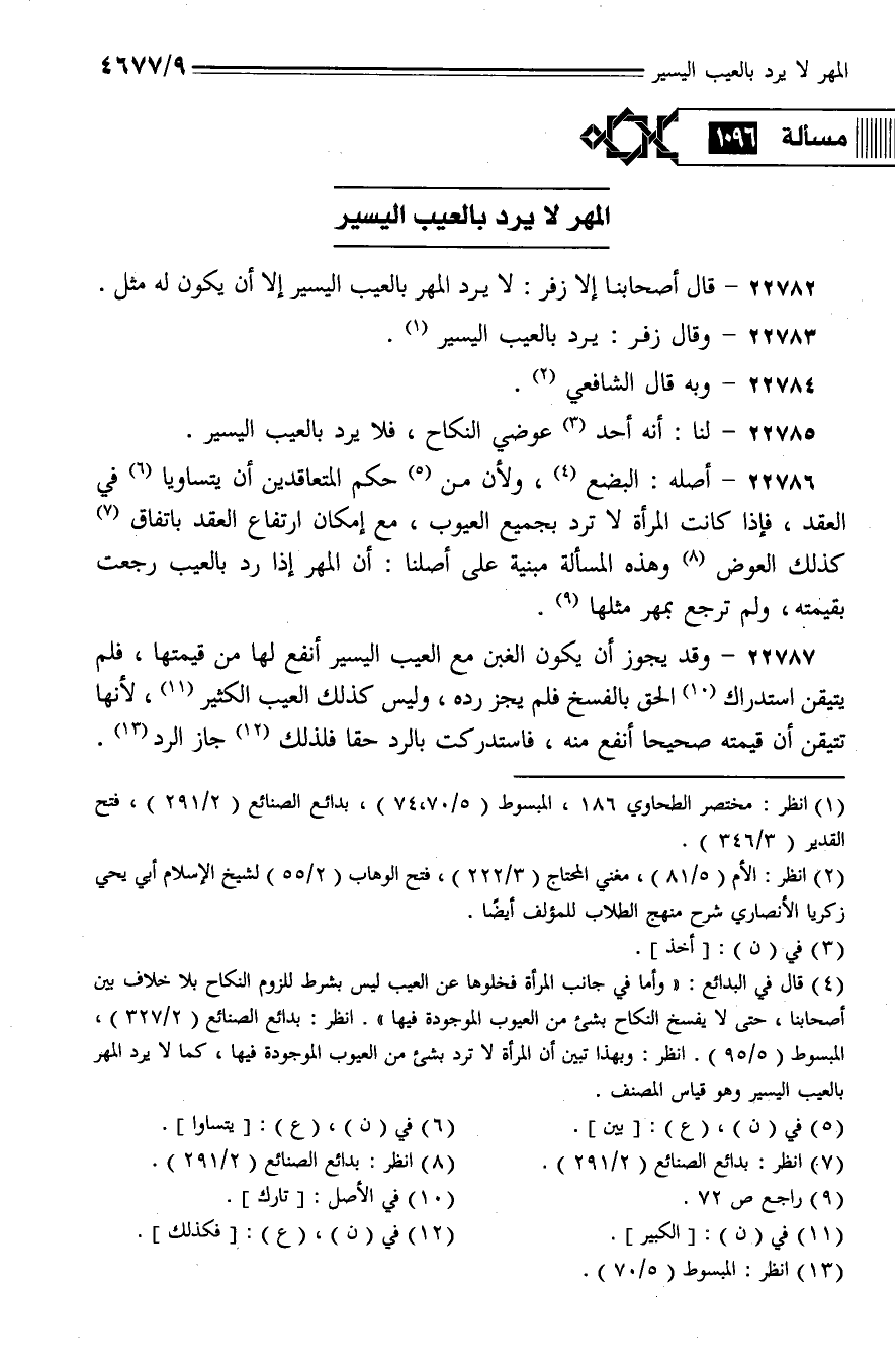 22782 - قال أصحابنا إلا زفر: لا يرد المهر بالعيب اليسير إلا أن يكون له مثل.
