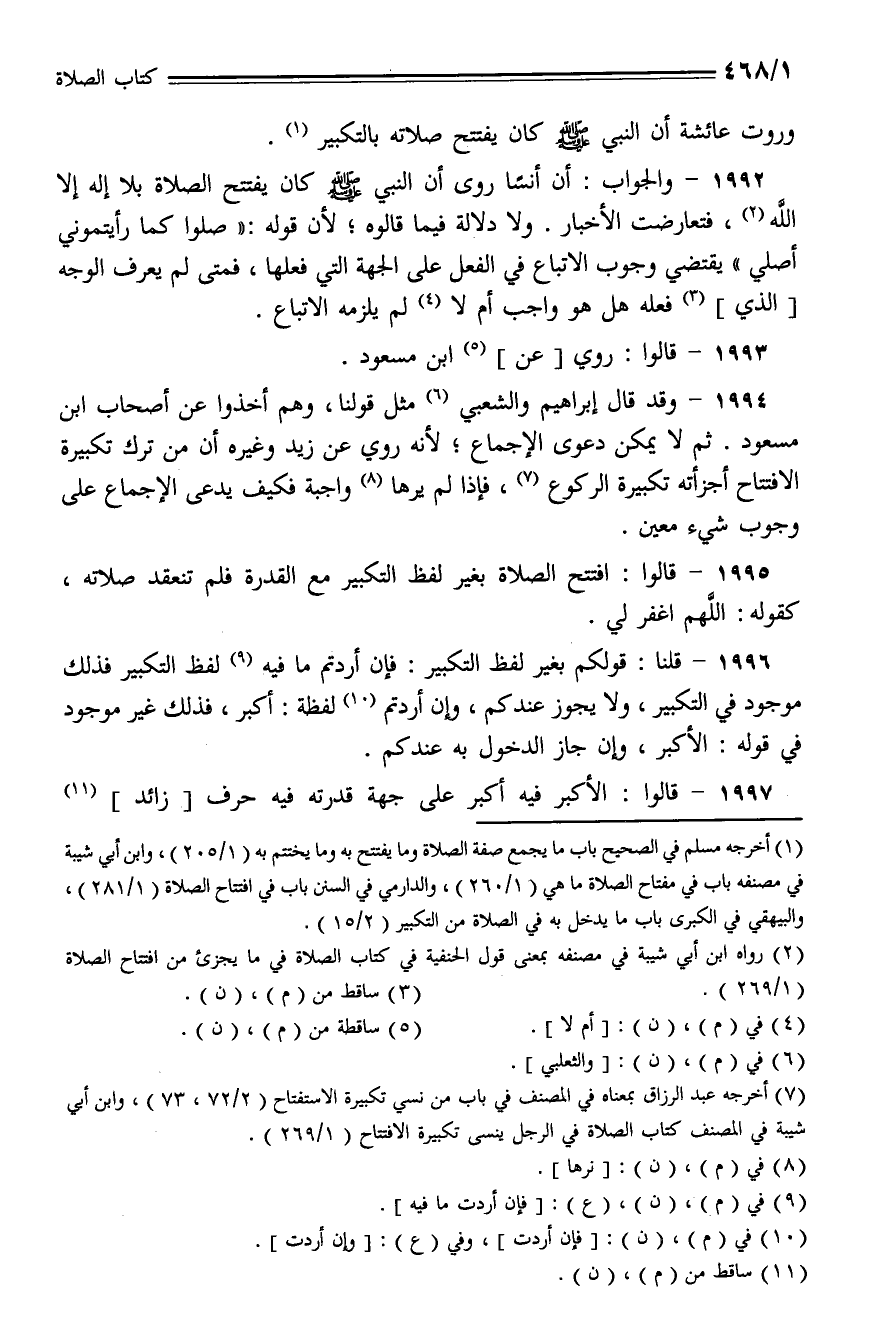 1994 - وقد قال إبراهيم والشعبي مثل قولنا، وهم أخذوا عن أصحاب ابن مسعود. ثم لا يمكن دعوى الإجماع؛ لأنه روي عن زيد وغيره أن من ترك تكبيرة الافتتاح أجزأته تكبيرة الركوع، فإذا لم يرها واجبة فكيف يدعى الإجماع على وجوب شيء معين.