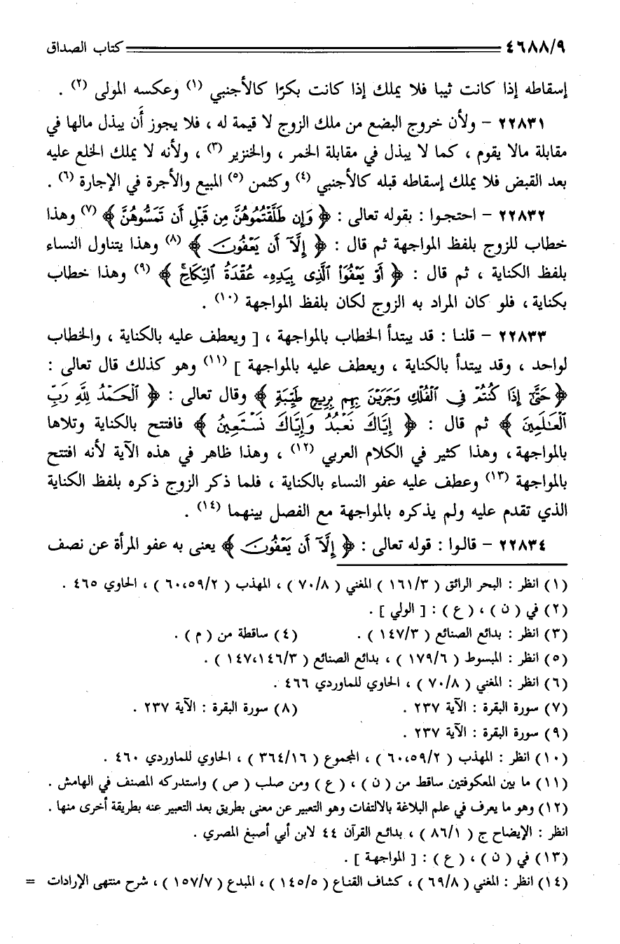 22833 - قلنا: قد يبتدأ الخطاب بالمواجهة، [ويعطف عليه بالكناية، والخطاب لواحد، وقد يبتدأ بالكناية، ويعطف عليه بالمواجهة] وهو كذلك قال تعالى: {حتى إذا كنتم في الفلك وجرين بهم بريح طيبة} وقال تعالى: {الحمد لله رب العالمين} ثم قال: {إياك نعبد وإياك نستعين} فافتتح بالكناية وتلاها بالمواجهة، وهذا كثير في الكلام العربي، وهذا ظاهر في هذه الآية لأنه افتتح بالمواجهة وعطف عليه عفو النساء بالكناية، فلما ذكر الزوج ذكره بلفظ الكناية الذي تقدم عليه ولم يذكره بالمواجهة مع الفصل بينهما.