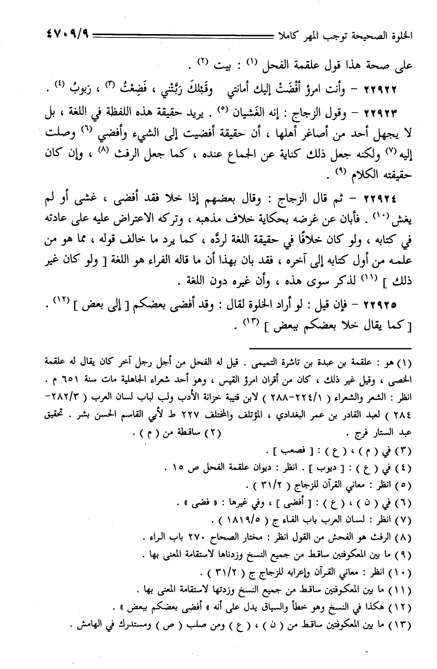 22924 - ثم قال الزجاج: وقال بعضهم إذا خلا فقد أفضى، غشي أو لم يغش. فأبان عن غرضه بحكاية خلاف مذهبه، وتركه الاعتراض عليه على عادته في كتابه، ولو كان خلافا في حقيقة اللغة لرده، كما يرد ما خالف قوله، مما هو من علمه من أول كتابه إلى آخره، فقد بان بهذا أن ما قاله الفراء هو اللغة] ولو كان غير ذلك [لذكر سوى هذه، وأن غيره دون اللغة.