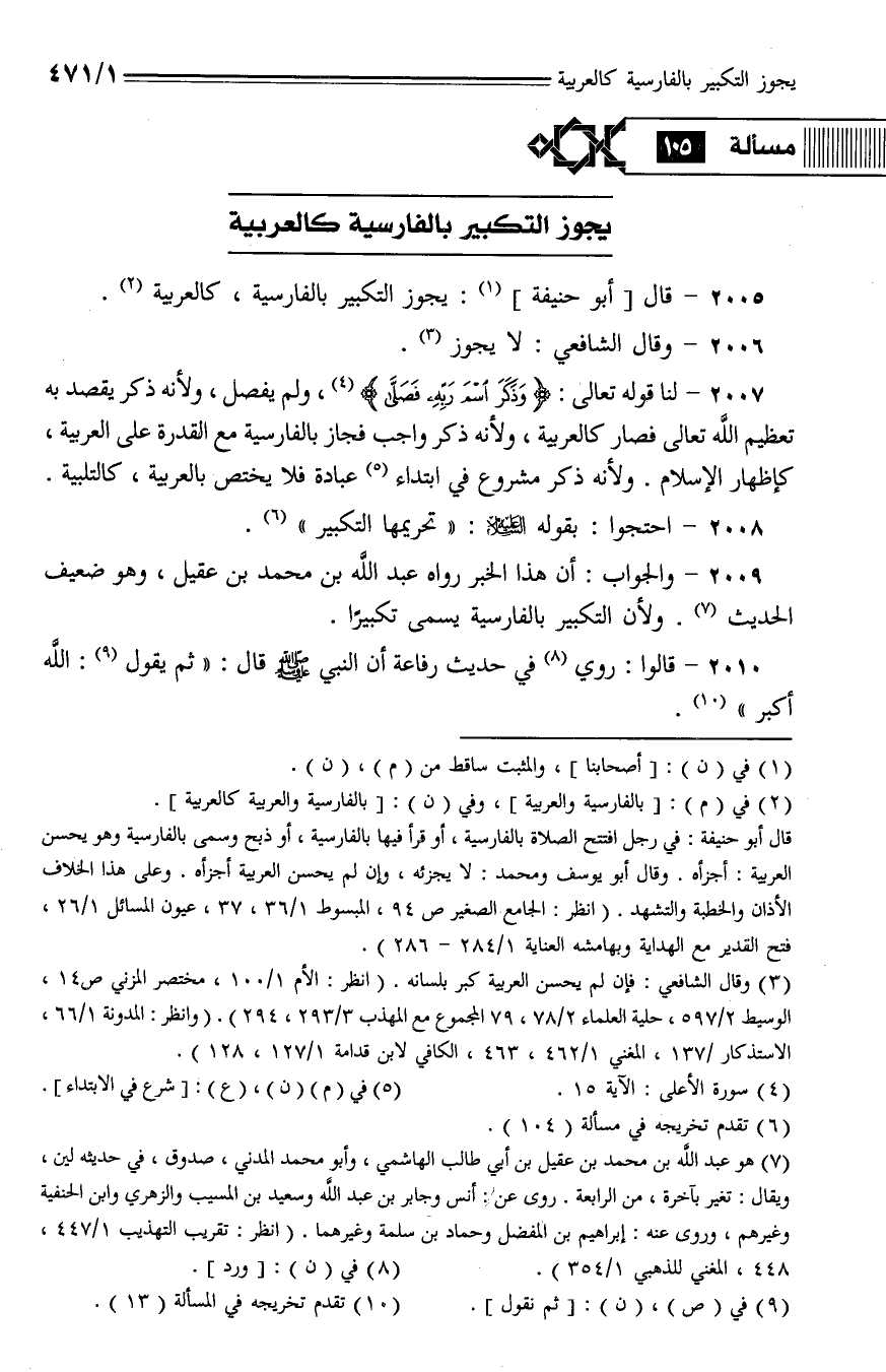 2005 - قال أبو حنيفة: يجوز التكبير بالفارسية، كالعربية.