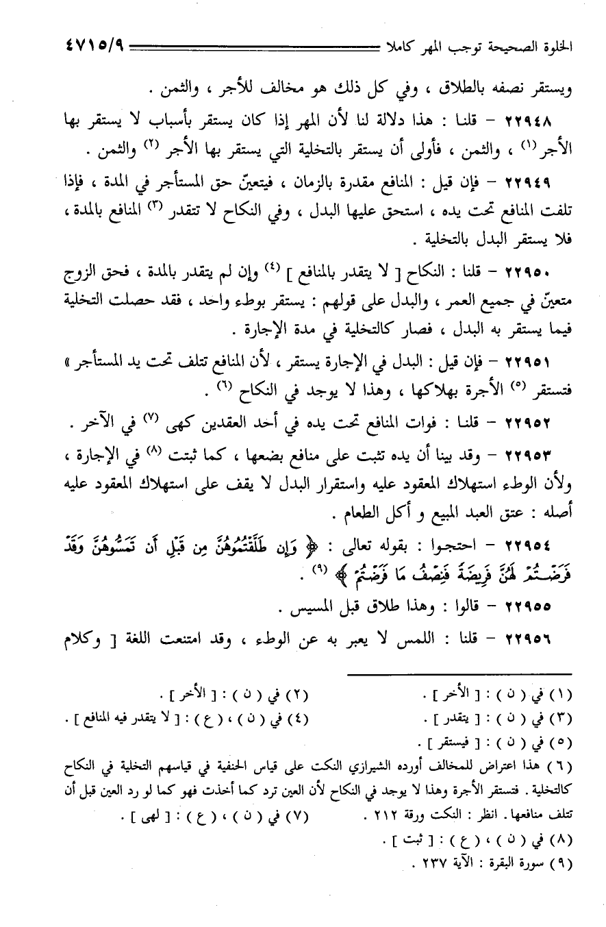 22948 - قلنا: هذا دلالة لنا لأن المهر إذا كان يستقر بأسباب لا يستقر بها الأجر، والثمن، فأولى أن يستقر بالتخلية التي يستقر بها الأجر والثمن.