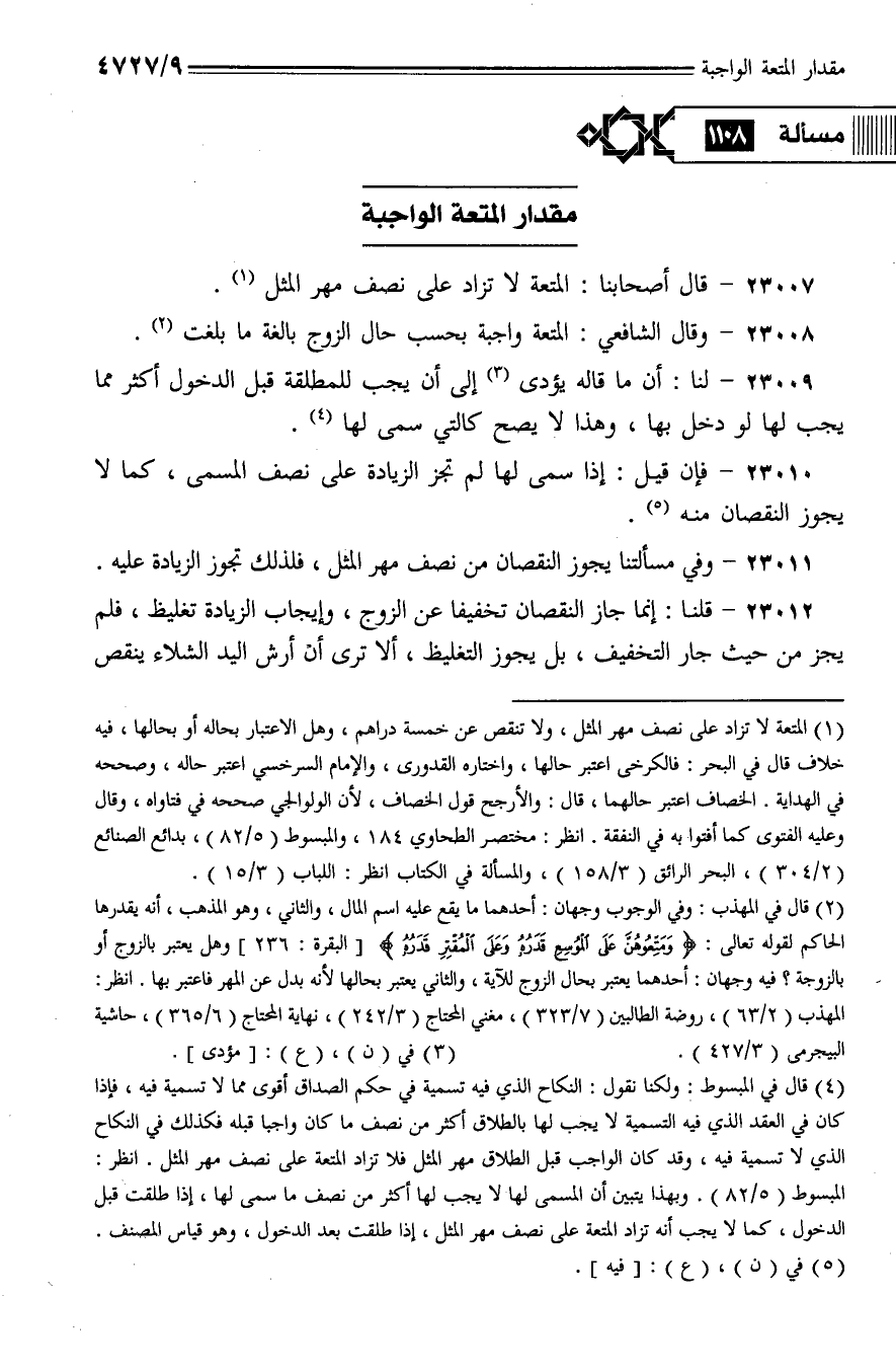 23008 - وقال الشافعي: المتعة واجبة بحسب حال الزوج بالغة ما بلغت.