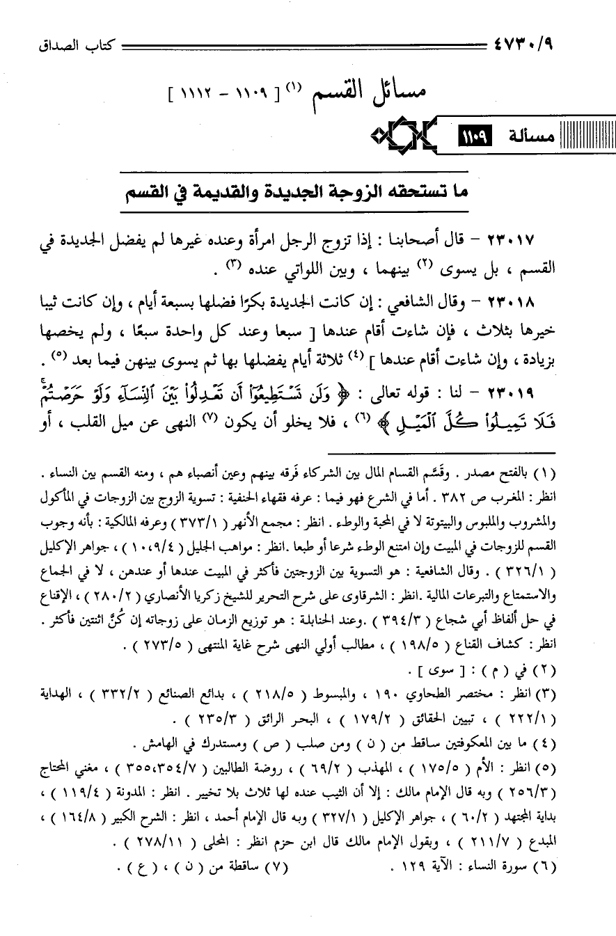 23017 - قال أصحابنا: إذا تزوج الرجل امرأة وعنده غيرها لم يفضل الجديدة في القسم، بل يسوي بينهما، وبين اللواتي عنده.