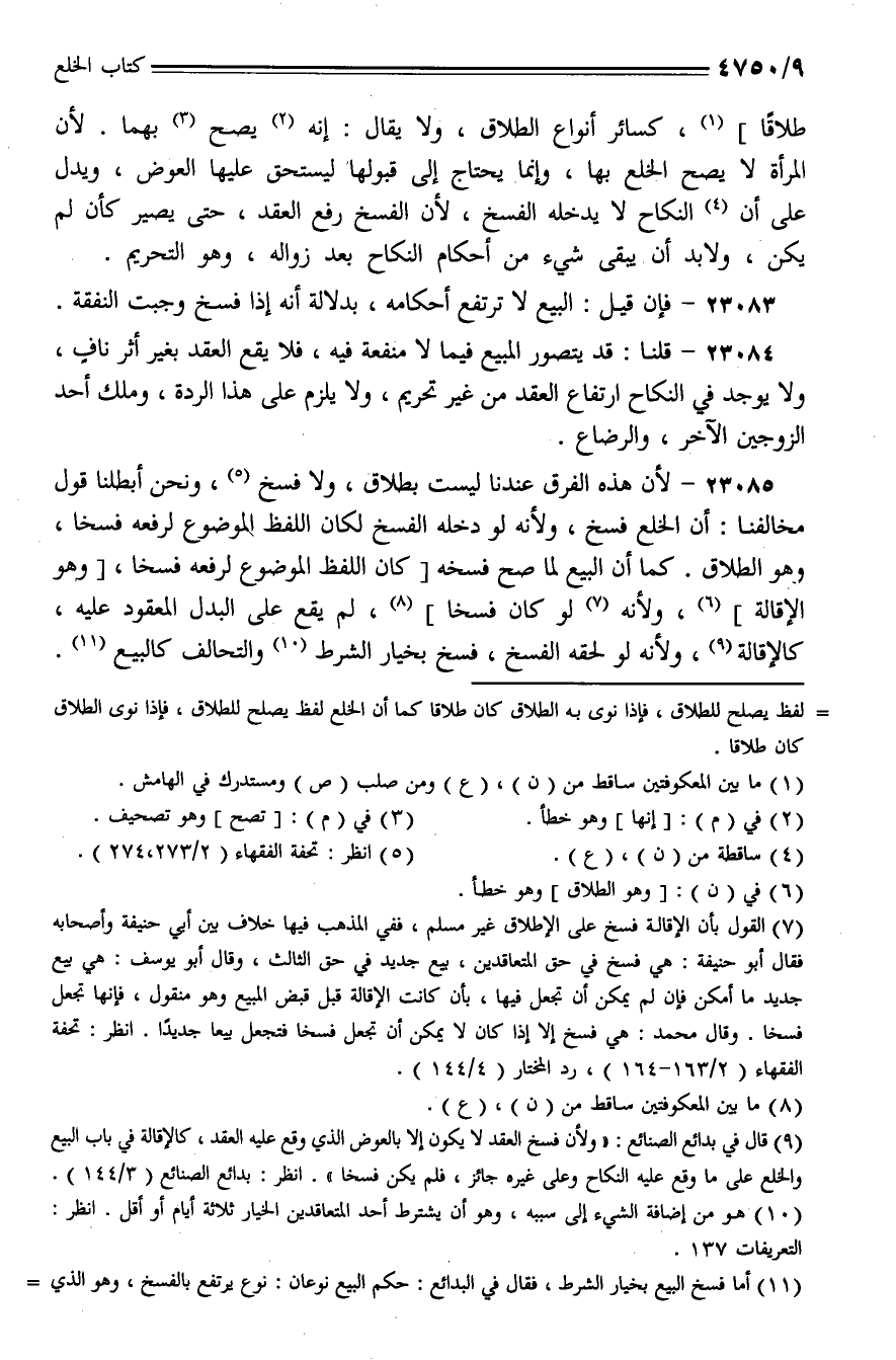 23085 - لأن هذه الفرق عندنا ليست بطلاق، ولا فسخ، ونحن أبطلنا قول مخالفنا: أن الخلع فسخ، ولأنه لو دخله الفسخ لكان اللفظ الموضوع لرفعه فسخًا، وهو الطلاق. كما أن البيع لما صح فسخه [كان اللفظ الموضوع لرفعه فسخًا، [وهو الإقالة]، ولأنه لو كان فسخًا]، لم يقع على البدل المعقود عليه، كالإقالة، ولأنه لو لحقه الفسخ، فسخ بخيار الشرط والتحالف كالبيع.