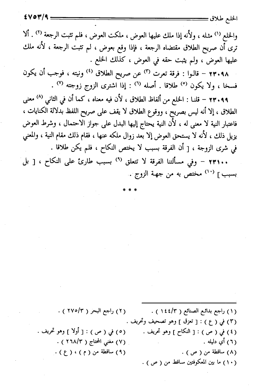 23098 - قالوا: فرقة تعرت عن صريح الطلاق ونيته، فوجب أن يكون فسخًا، ولا يكون طلاقًا. أصله: إذا اشترى الزوج زوجته.