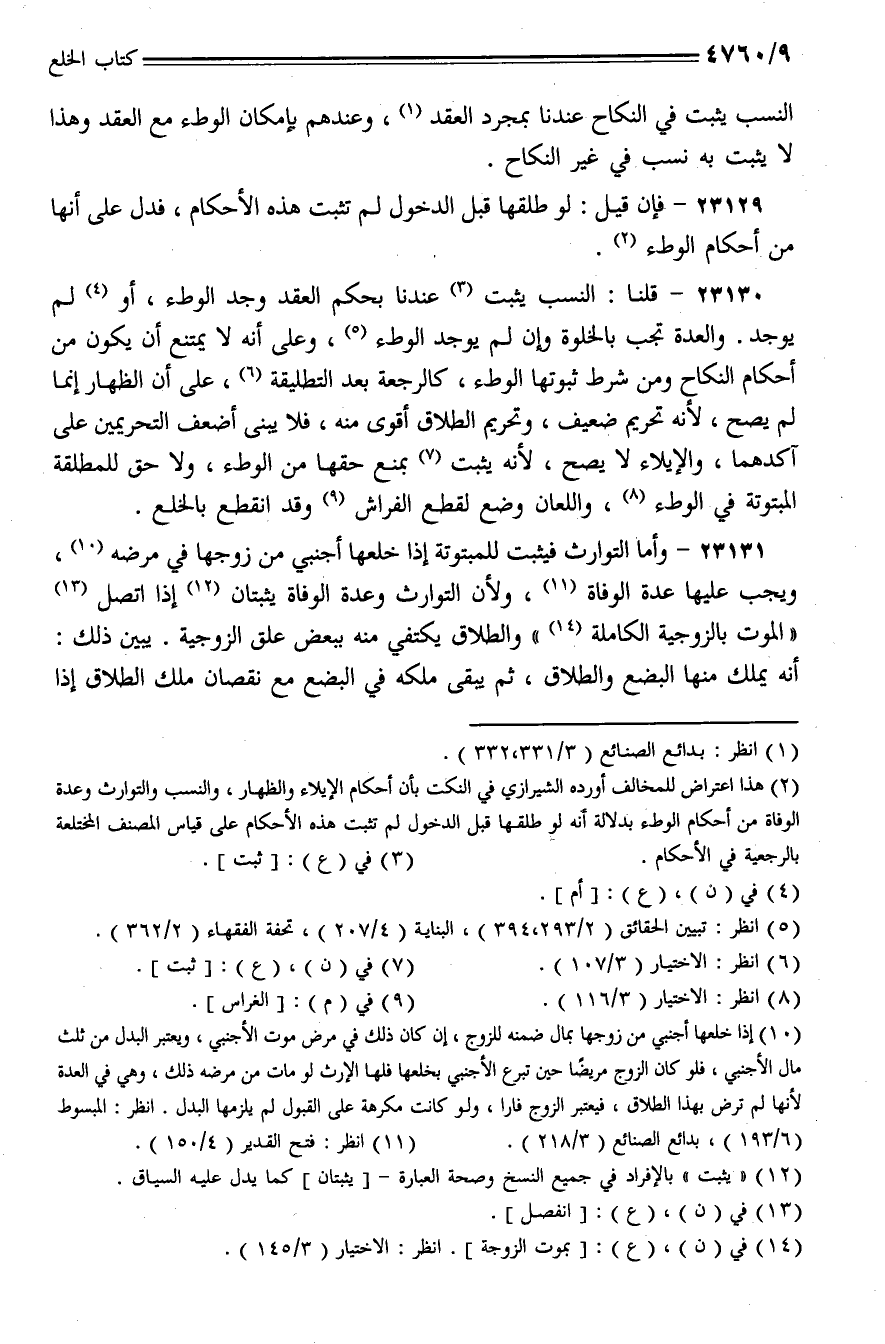23130 - قلنا: النسب يثبت عندنا بحكم العقد وجد الوطء، أو لم يوجد. والعدة تجب بالخلوة وإن لم يوجد الوطء، وعلى أنه لا يمتنع أن يكون من أحكام النكاح ومن شرط ثبوتها الوطء، كالرجعة بعد التطليقة، على أن الظهار إنما يصح، لأنه تحريم ضعيف، وتحريم الطلاق أقوى منه، فلا يبنى أضعف التحريمين على آكدهما، والإيلاء لا يصح، لأنه يثبت بمنع حقها من الوطء، ولا حق للمطلقة المبتوتة في الوطء، واللعان وضع لقطع الفراش وقد انقطع بالخلع.