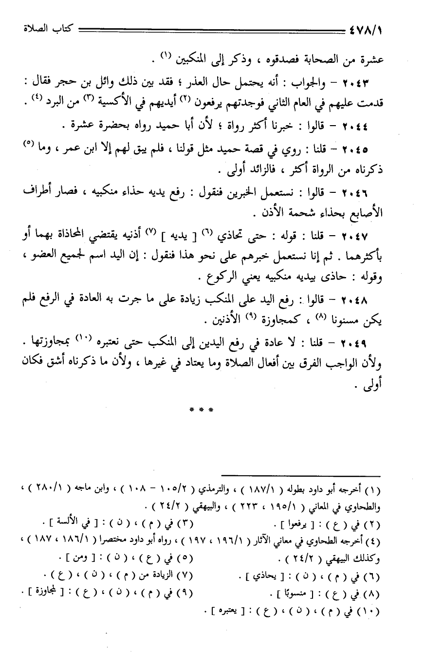 2047 - قلنا: قوله: حتى يحاذي يديه أذنيه يقتضي المحاذاة بهما أو بأكثرهما. ثم إنا نستعمل خبرهم على نحو هذا فنقول: إن اليد اسم لجميع العضو، وقوله: حاذى بيديه منكبيه يعني الركوع.