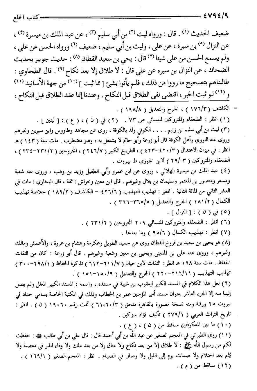 ضعيف الحديث. قال: ورواه ليث بن أبي سليم، عن عبد الملك بن ميسرة، عن النزال بن سبرة، عن علي، وليث بن أبي سليم، ضعيف ورواه الحسن عن علي، ولم يسمع الحسن من علي شيئًا قال: يحيى بن سعيد القطان: حديث جوبير بحديث الضحاك، عن النزال بن سبره عن علي قال: لا طلاق إلا بعد نكاح. قال الطحاوي: طالبناهم بتصحيح ما رووا من ذلك، فلم يأتوا بشيء [مما ثبت] من جهة الأسانيد ولو ثبت الخبر، اقتضى نفي الطلاق قبل النكاح. وعندنا إنما عقد الطلاق قبل النكاح،