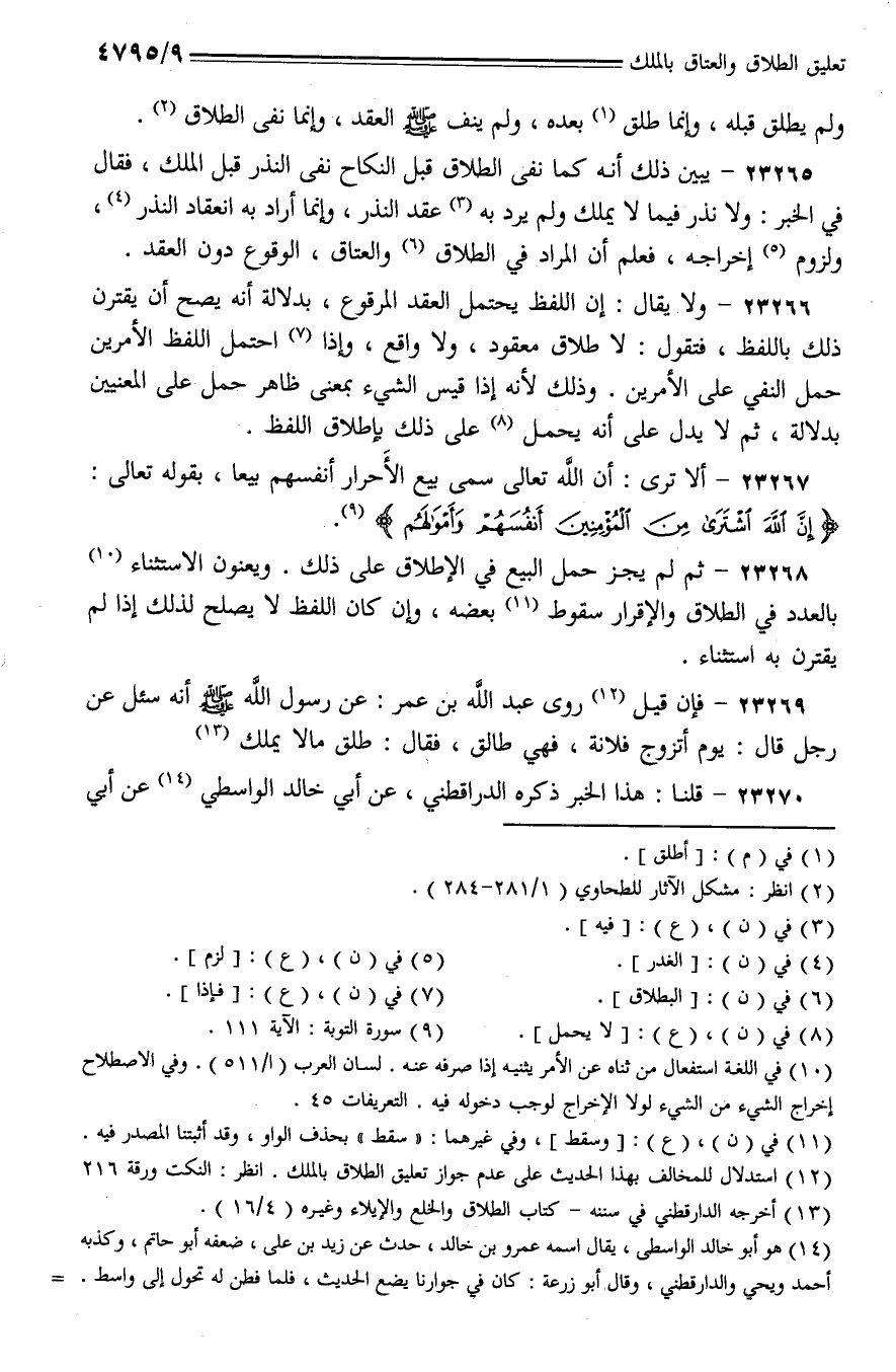23265 - يبين ذلك أنه كما نفى الطلاق قبل النكاح نفى النذر قبل الملك، فقال في الخبر: ولا نذر فيما لا يملك ولم يرد به عقد النذر، وإنما أراد به انعقاد النذر، ولزوم إخراجه، فعلم أن المراد في الطلاق والعتاق، الوقوع دون العقد.