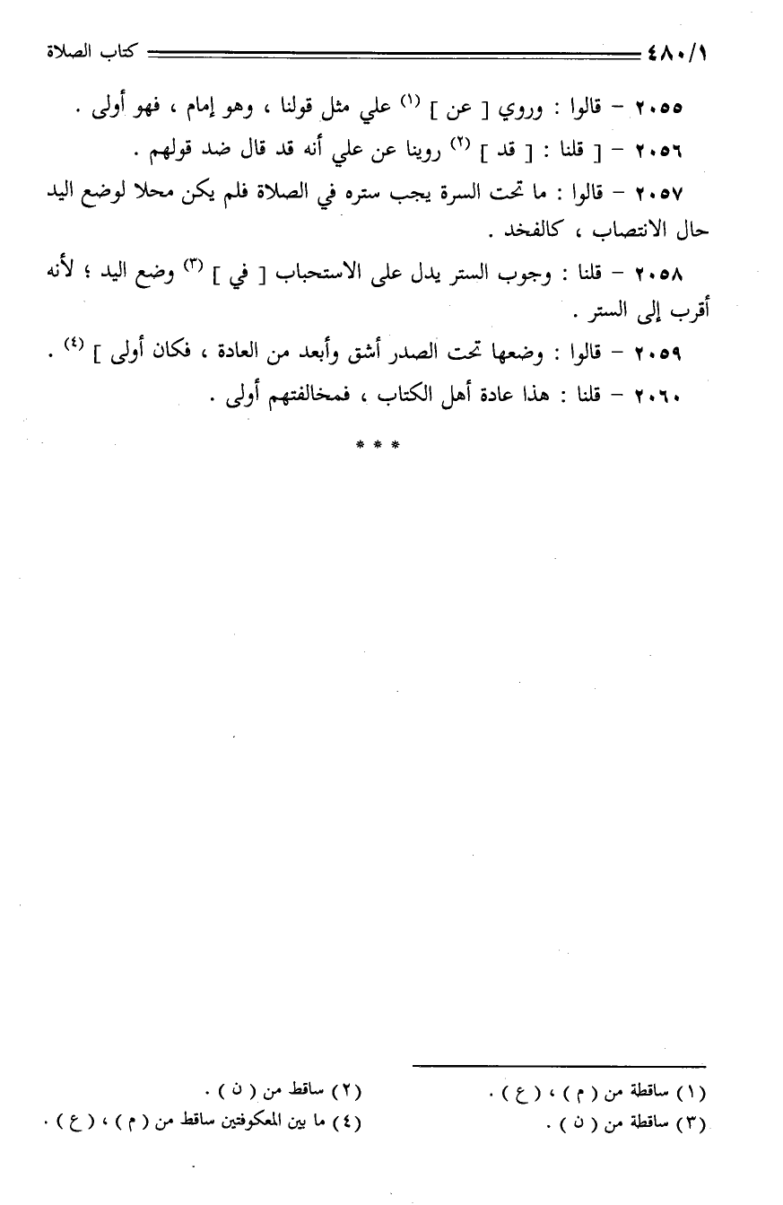 2057 - قالوا: ما تحت السرة يجب ستره في الصلاة فلم يكن محلا لوضع اليد حال الانتصاب، كالفخذ.