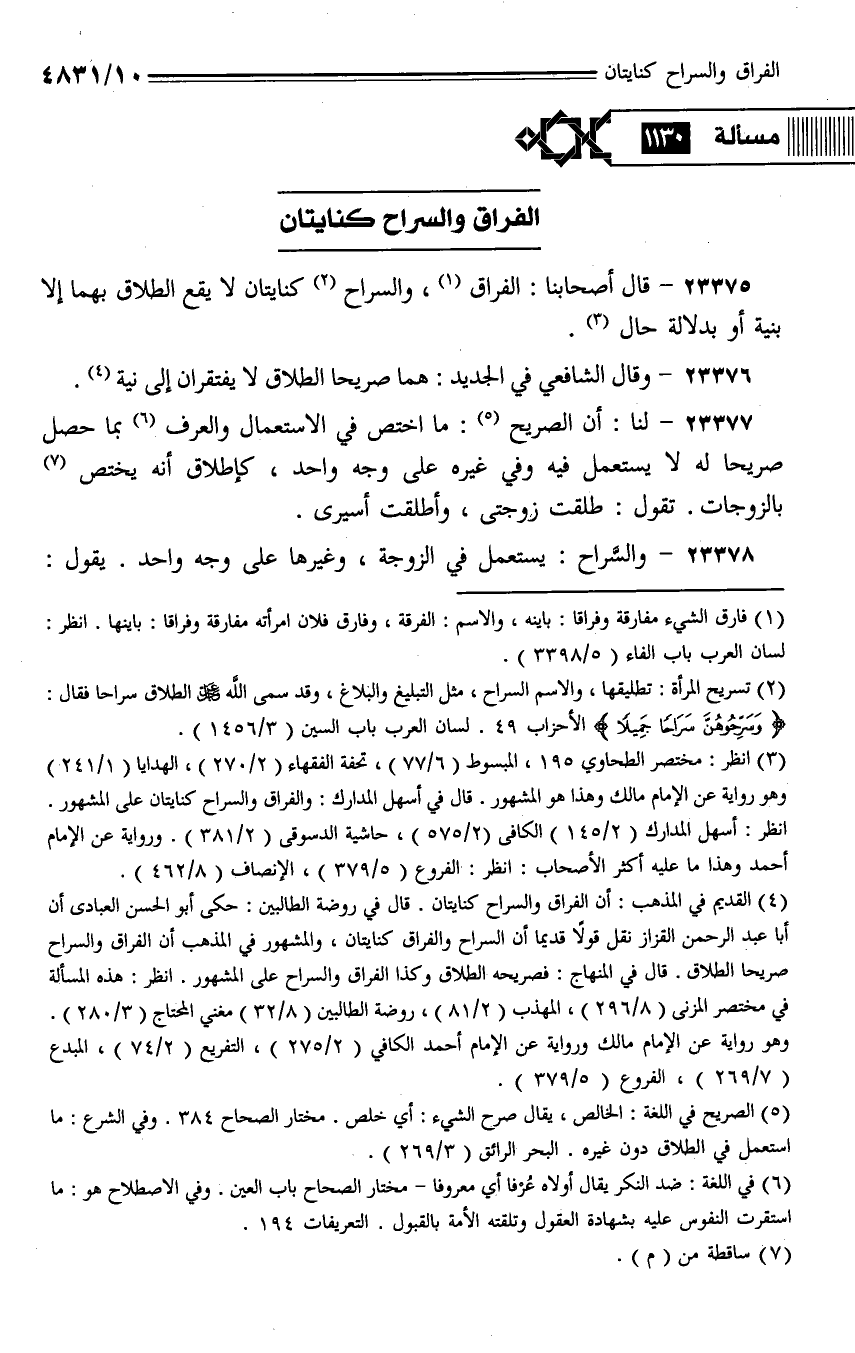 23375 - قال أصحابنا: الفراق، والسراح كنايتان لا يقع الطلاق بهما إلا بنية أو بدلالة حال