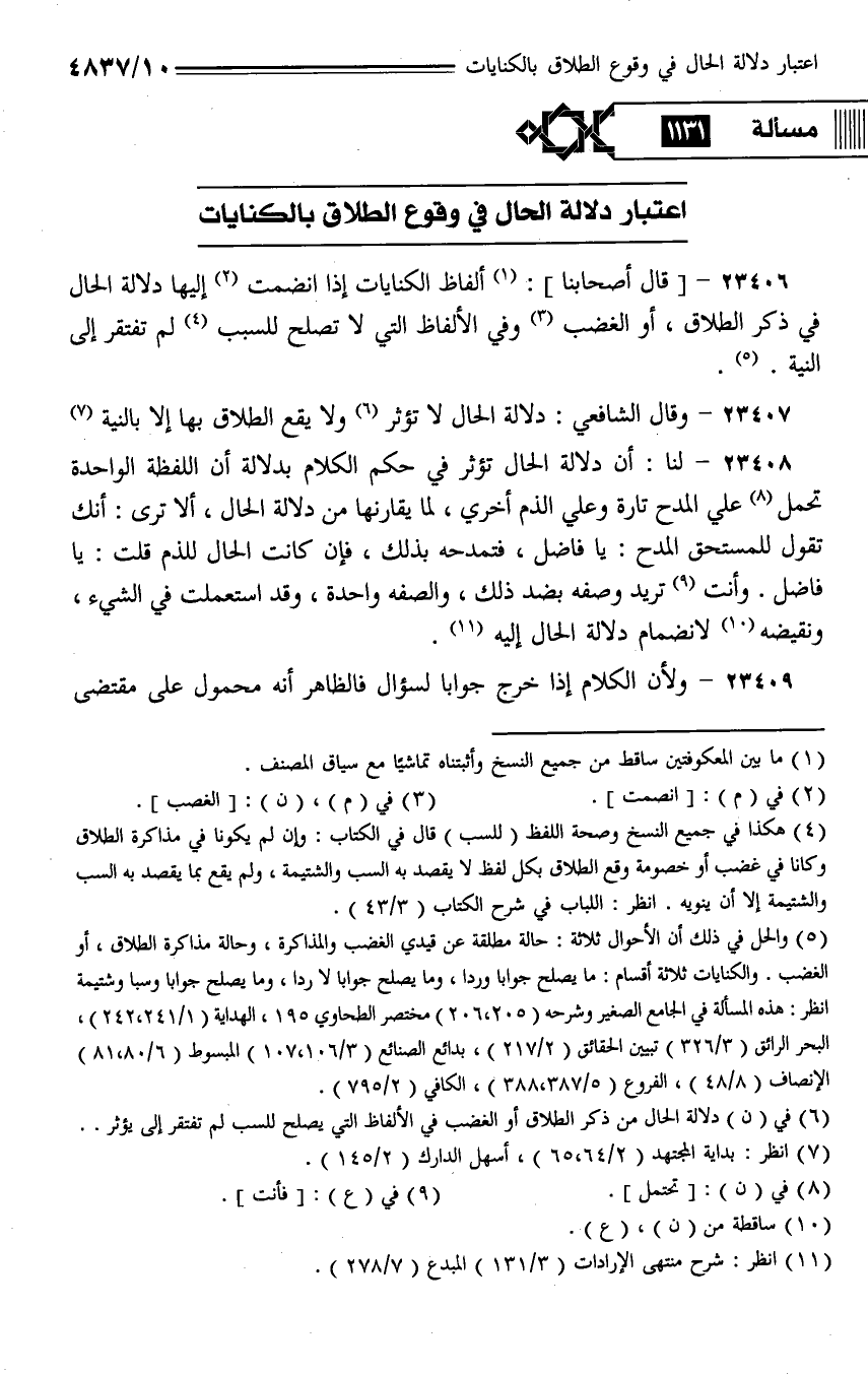 23406 - [قال أصحابنا]: ألفاظ الكنايات إذا انضمت إليها دلالة الحال في ذكر الطلاق، أو الغضب وفي الألفاظ التي لا تصلح للسبب لم تفتقر إلى النية.