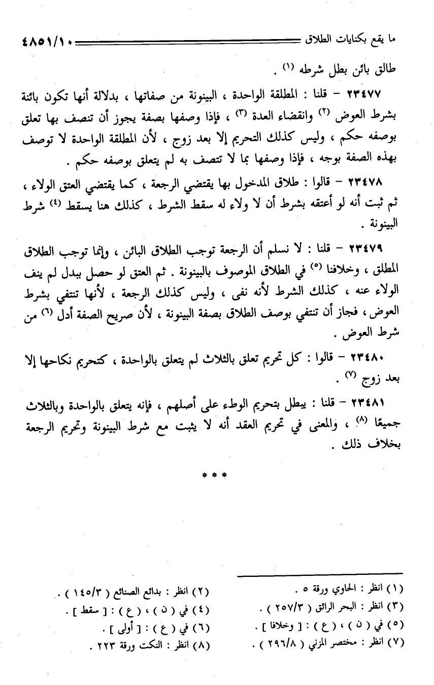 23477 - قلنا: المطلقة الواحدة، البينونة من صفاتها، بدلالة أنها تكون بائنة بشرط العوض وانقضاء العدة، فإذا وصفها بصفة يجوز أن تنصف بها تعلق بوصفه حكم، وليس كذلك التحريم إلا بعد زوج، لأن المطلقة الواحدة لا توصف بهذه الصفة بوجه، فإذا وصفها بما تتصف به لم يتعلق بوصفه حكم.
