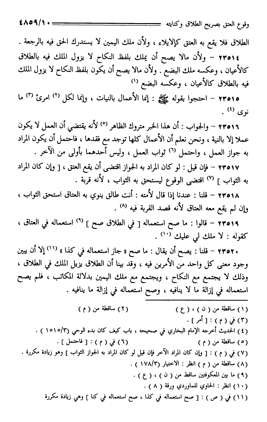 23518 - قلنا: عندنا إذا قال لأمته: أنت طالق ينوي به العتاق استحق الثواب، وإن لم يقع معه العتاق لأنه قصد القربة به.