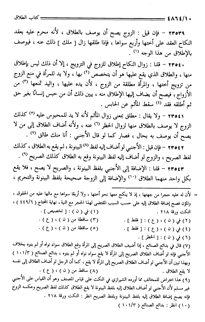 23541 - ولا يقال: مطلق بمعنى زوال المأثم لأنه لا يد للمحبوس عليه كذلك الزوج لا يوصف بالطلاق منها لزوال الحظر عنه، ولأنه أضاف الطلاق إلى من لا يصح أن يوصف به بحال، فصار كما لو قال الأجنبي: أنا منك طالق.