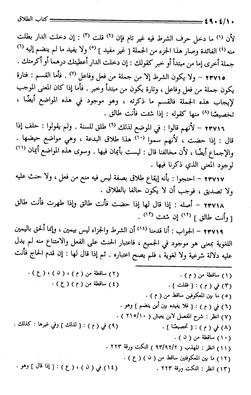 23715 - ولا يكون الشرط إلا من جملة من فعل وفاعل. فأما القسم: فتارة يكون جملة من فعل وفاعل، وتارة يكون من مبتدأ وخبر. فأما إذا كان المعنى الموجب لإيجاب هذه الجملة فالقسم ما ذكرته، وهو موجود في هذه المواضع أيضًا، تخصيصًا منها كقوله: إذا شئت فأنت طالق.
