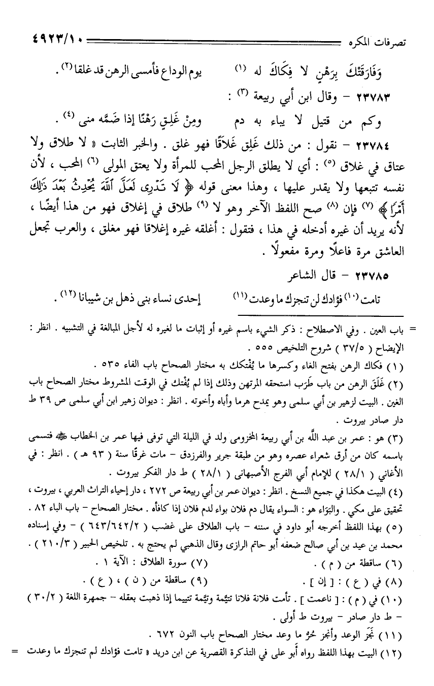 23784 - نقول: من ذلك غلق غلاقًا فهو غلق. والخبر الثابت (لا طلاق ولا عتاق في غلاق: أي لا يطلق الرجل المحب للمرأة ولا يعتق المولى المحب، لأن نفسه تتبعها ولا يقدر عليها، وهذا معنى قوله (لا تدري لعل الله يحدث بعد ذلك أمرًا) فإن صح اللفظ الآخر وهو لا طلاق في إغلاق فهو من هذا أيضًا، لأنه يريد أن غيره أدخله في هذا، فتقول: أغلقه غيره إغلاقًا فهو مغلق، والعرب تجعل العاشق مرة فاعلًا ومرة مفعولًا.