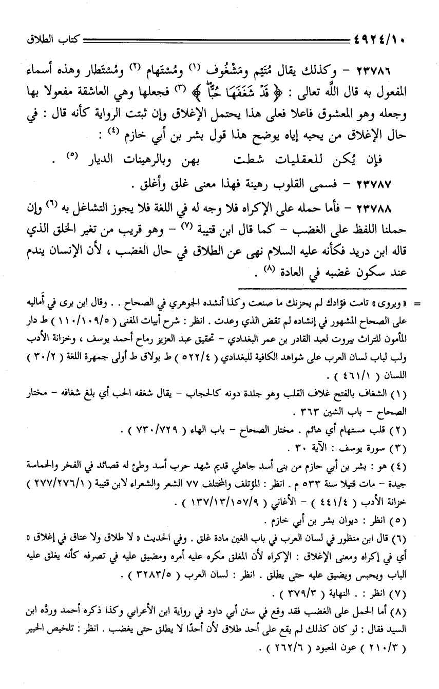 23786 - وكذلك يقال متيم ومشغوف ومستهام ومستطار وهذه أسماء المفعول به قال الله تعالى: (قد شغفها حبًا) فجعلها وهي العاشقة مفعولًا بها وجعله وهو المعشوق فاعلًا فعلى هذا يحتمل الإغلاق وإن ثبتت الرواية كأنه قال: في حال الإغلاق من يحبه إياه يوضح هذا قول بشر بن أبي خازم: