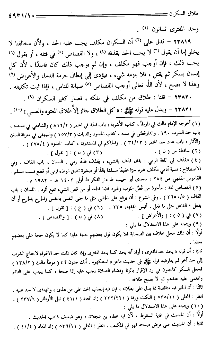 23819 - فدل على أن السكران مكلف يجب عليه الحد، ولأن مخالفنا لا يخلوا إما أن يقول لا يجب الحد بقذفه، ولا القصاص في قتله، أو يقول يجب ذلك، فإن أوجب فهو مكلف، وإن لم يوجب ذلك كان فاسدًا، لأن كل إنسان يسكر ثم يقتل، فلا يلزمه شيء، فيؤدي إلى إبطال حرمة الدماء والأعراض وهذا لا يصح، لأن الله تعالى أوجب القصاص صيانة للناس، فإذا ثبت تكليفه.