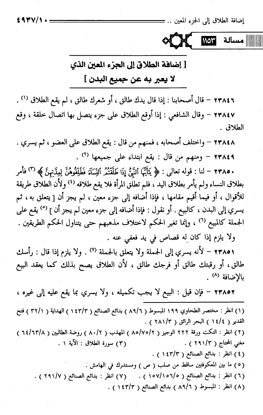 23851 - لأنه يسري إلى الجملة ولا يتعلق بالجملة. ولا يلزم إذا قال: رأسك طالق، أو رقبتك طالق أو فرجك طالق، لأن الطلاق يصح بذلك كما يقع البيع بالإضافة.