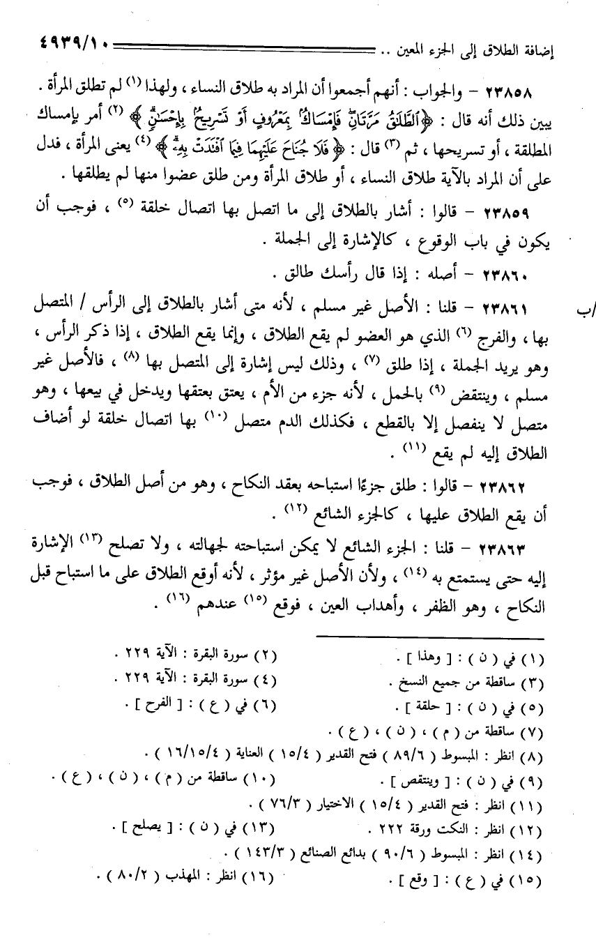 23863 - قلنا: الجزء الشائع لا يمكن استباحته لجهالته، ولا تصلح الإشارة إليه حتى يستمتع به، ولأن الأصل غير مؤثر، لأنه أوقع الطلاق على ما استباح قبل النكاح، وهو الظفر، وأهداب العين، فوقع عندهم.