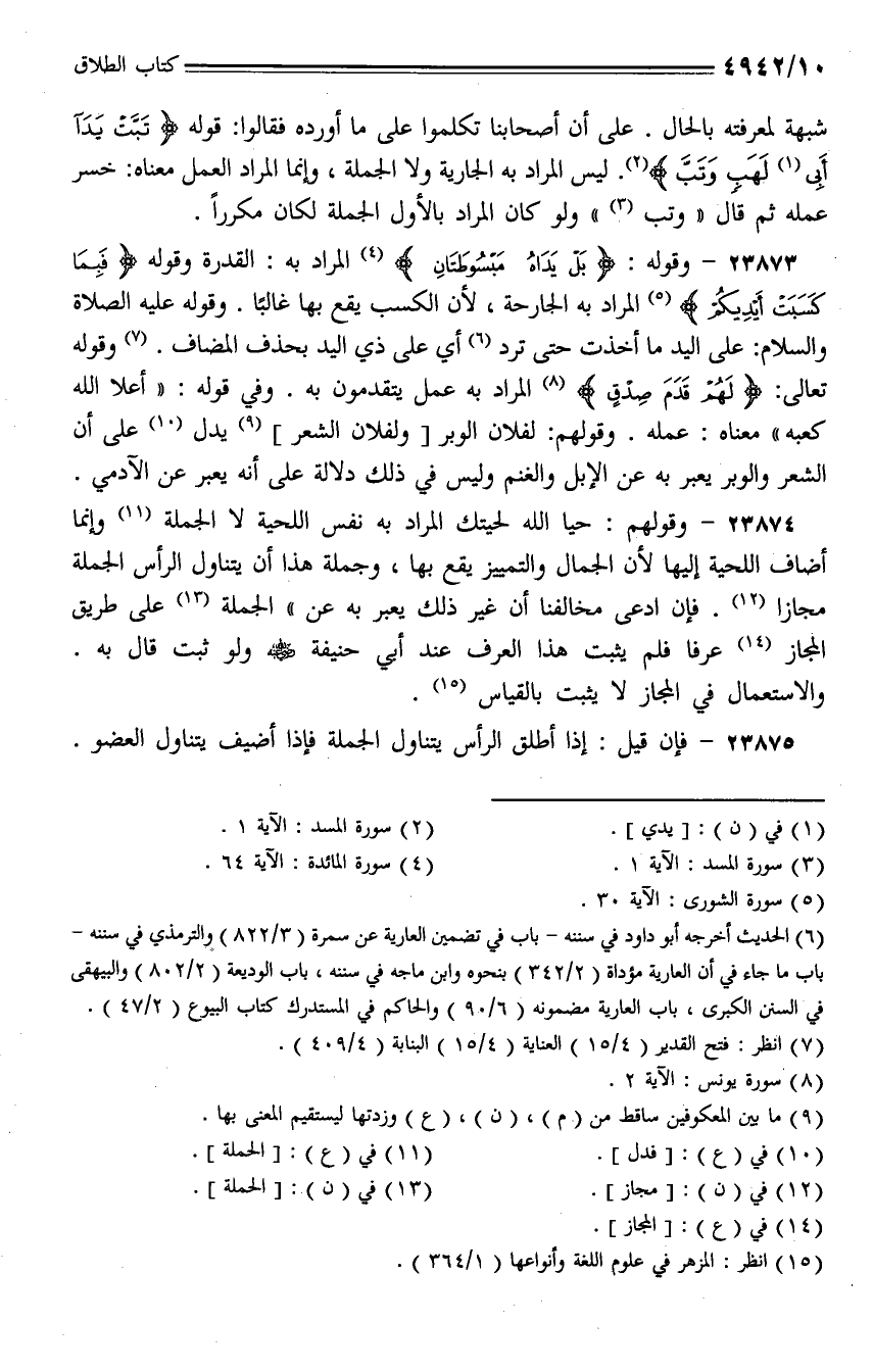 23874 - وقولهم: حيا الله لحيتك المراد به نفس اللحية لا الجملة وإنما أضاف اللحية إليها لأن الجمال والتمييز يقع بها، وجملة هذا أن يتناول الرأس الجملة مجازًا. فإن ادعى مخالفنا أن غير ذلك يعبر به عن) الجملة على طريق المجاز عرفا فلم يثبت هذا العرف عند أبي حنيفة - رضي الله عنه - ولو ثبت قال به. والاستعمال في المجاز لا يثبت بالقياس.