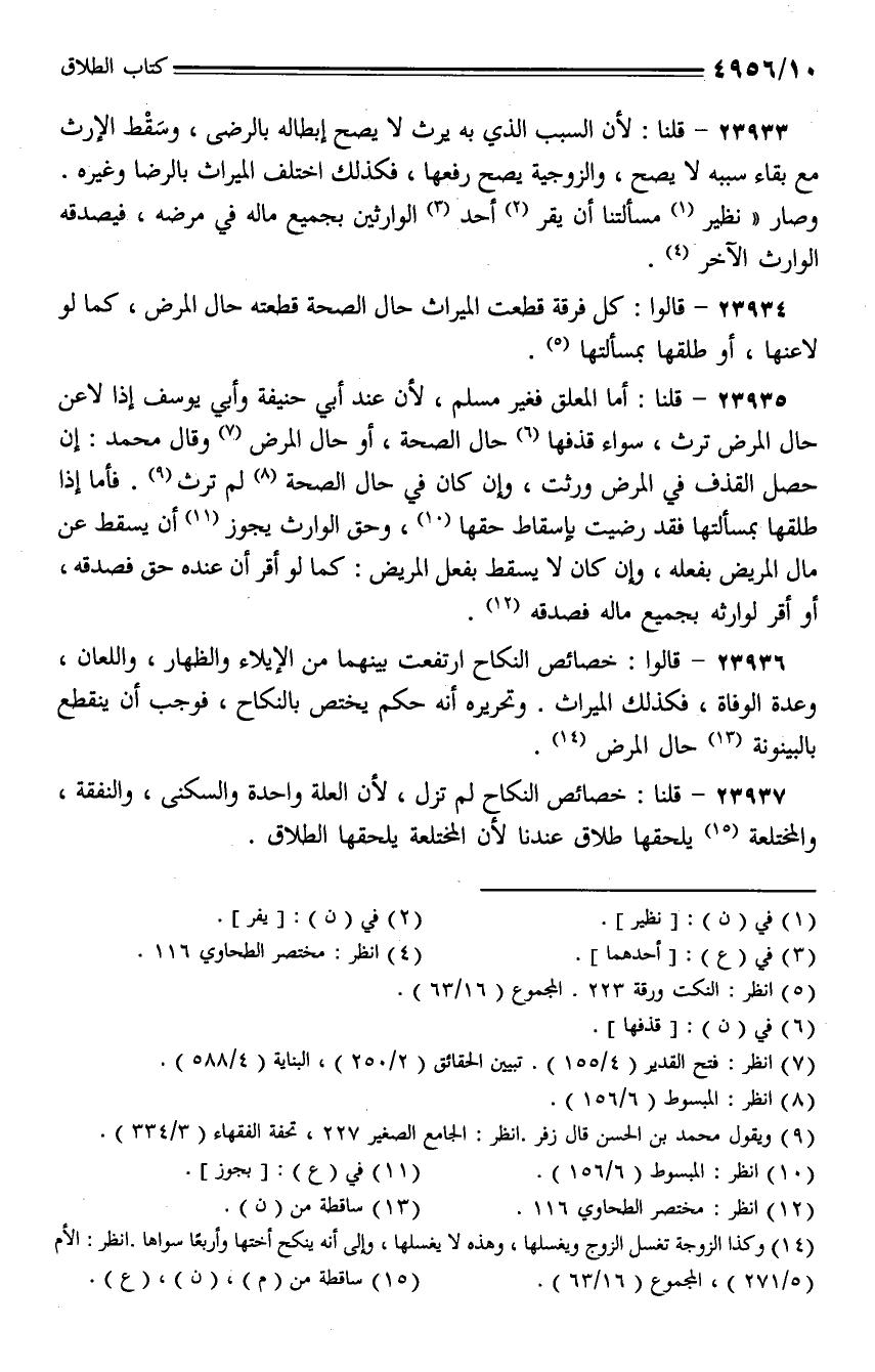 23934 - قالوا: كل فرقة قطعت الميراث حال الصحة قطعته حال المرض، كما لو لاعنها، أو طلقها بمسألتها.
