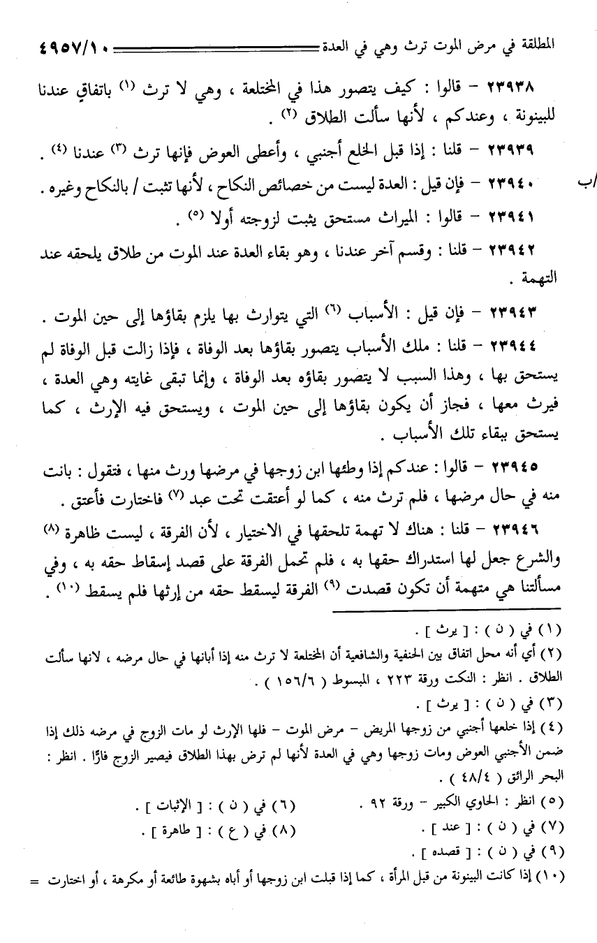 23944 - قلنا: ملك الأسباب يتصور بقاؤها بعد الوفاة، فإذا زالت قبل الوفاة لم يستحق بها، وهذا السب لا يتصور بقاؤه بعد الوفاة، وإنما تبقى غايته وهي العدة، فيرث معها، فجاز أن يكون بقاؤها إلى حين الموت، ويستحق فيه الإرث، كما يستحق ببقاء تلك الأسباب.