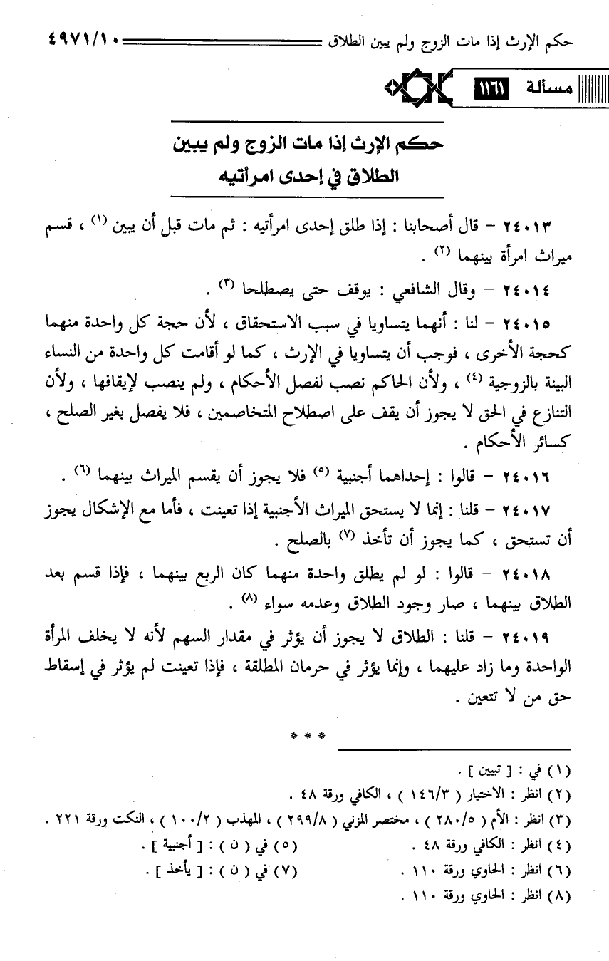 24013 - قال أصحابنا: إذا طلق إحدى امرأتيه: ثم مات قبل أن يبين، قسم ميراث امرأة بينهما.