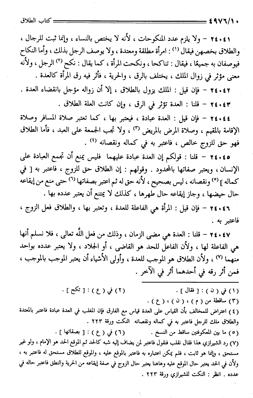 24045 - قلنا: قولكم إن العدة عبادة عليهما فليس يمنع أن تجمع العبادة على الإنسان، ويعتبر صفاتها بالمحدود. وقولهم: إن الطلاق حق للزوج، فاعتبر به [في كماله] ونقصانه، ليس بصحيح، لأنه حق له ثم اعتبر بصفاتها حتى منع من إيقاعه حال حيضها، وجاز إيقاعه حال طهرها، كذلك لا يمتنع أن يعتبر عدده بها.