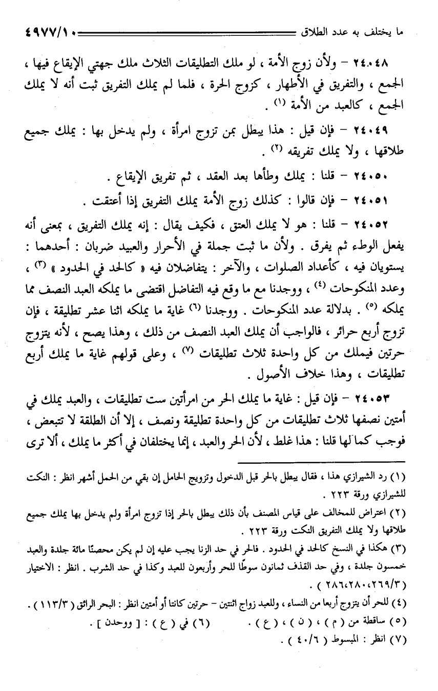 24053 - فإن قيل: غاية ما يملك الحر من امرأتين ست تطليقات، والعبد يملك في أمتين نصفها ثلاث تطليقات من كل واحدة تطليقة ونصف، إلا أن الطلقة لا تتبعض، فوجب كما لها قلنا: هذا غلط، لأن الحر والعبد، إنما يختلفان في أكثر ما يملك، ألا ترى