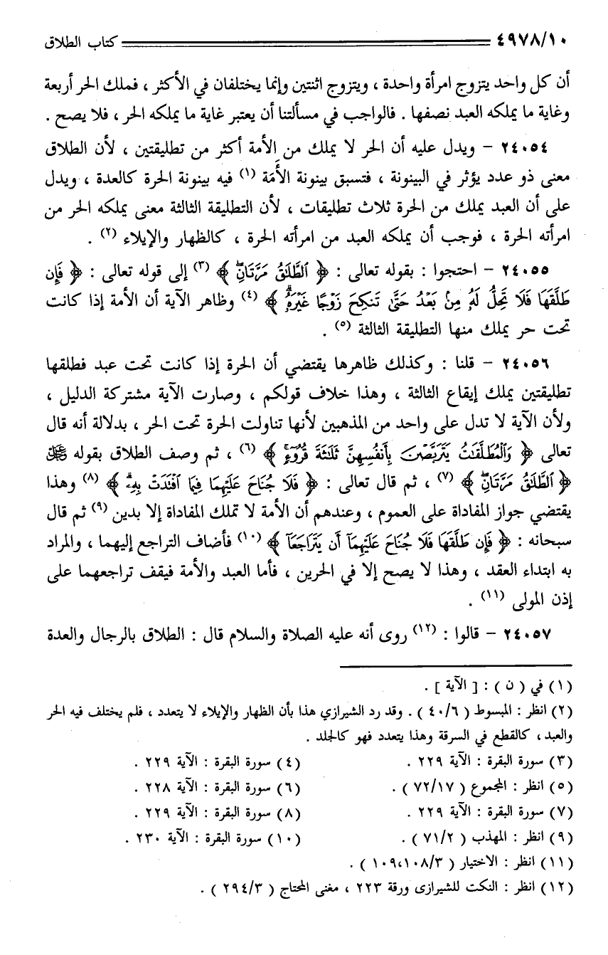 24054 - ويدل عليه أن الحر لا يملك من الأمة أكثر من تطليقتين، لأن الطلاق معنى ذو عدد يؤثر في البينونة، فتسبق بينونة الأمة فيه بينونة الحرة كالعدة، ويدل على أن العبد يملك من الحرة ثلاث تطليقات لأن التطليقة الثالثة معنى يملكه الحر من امرأته الحرة، فوجب أن يملكه العبد من امرأته الحرة، كالظهار والإيلاء.