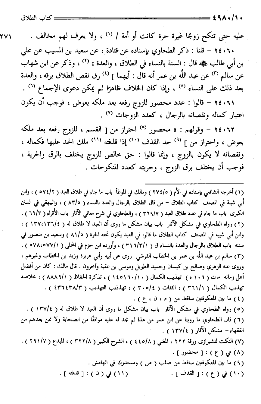 24060 - قلنا: ذكر الطحاوي بإسناده عن قتادة، عن سعيد بن المسيب عن علي بن أبي طالب - رضي الله عنه - قال: السنة بالنساء في الطلاق، والعدة)، وذكر عن ابن شهاب عن سالم عن عبد الله بن عمر أنه قال: أيهما] رق نقص الطلاق برقه، والعدة بعد ذلك على النساء، وإذا كان الخلاف ظاهرًا لم يكن دعوى الإجماع.