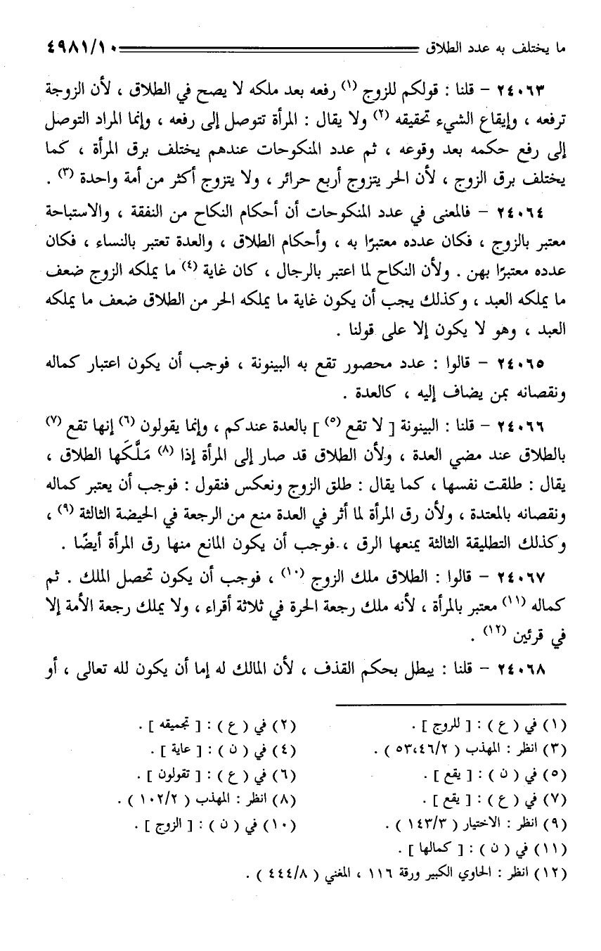 24063 - قلنا: قولكم للزوج رفعه بعد ملكه لا يصح في الطلاق، لأن الزوجة ترفعه، وإيقاع الشيء تحقيقه ولا يقال: المرأة تتوصل إلى رفعه، وإنما المراد التوصل إلى رفع حكمه بعد وقوعه، ثم عدد المنكوحات عندهم يختلف برق المرأة، كما يختلف برق الزوج، لأن الحر يتزوج أربع حرائر، ولا يتزوج أكثر من أمة واحدة.