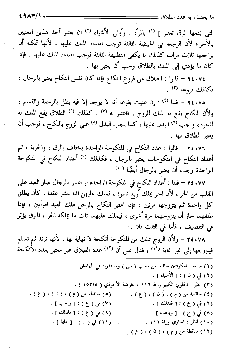 24076 - قالوا: عدد النكاح في المنكوحة الواحدة يختلف بالرق، والحرية، ثم أعداد النكاح في المنكوحات يعتبر بالرجال، فكذلك أعداد النكاح في المنكوحة الواحدة وجب أن يعتبر بالرجال أيضًا.