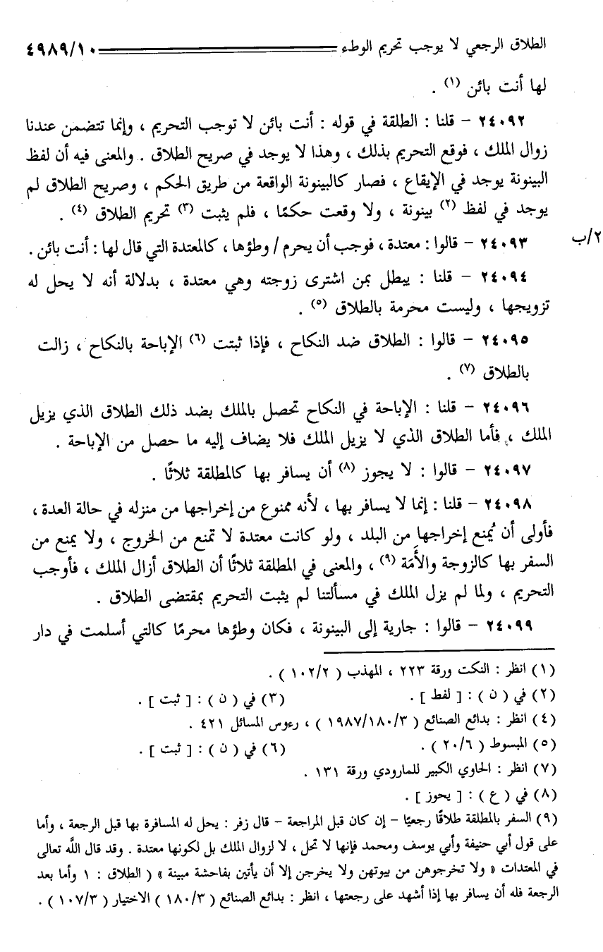 24092 - قلنا: الطلقة في قوله: أنت بائن لا توجب التحريم، وإنما تتضمن عندنا زوال الملك، فوقع التحريم بذلك، وهذا لا يوجد في صريح الطلاق. والمعنى فيه أن لفظ البينونة يوجد في الإيقاع، فصار كالبينونة الواقعة من طريق الحكم، وصريح الطلاق لم يوجد في لفظ بينونة، ولا وقعت حكمًا، فلم يثبت تحريم الطلاق.