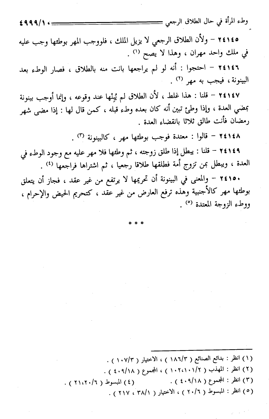 24145 - ولأن الطلاق الرجعي لا يزيل الملك، فلو وجب المهر بوطئها وجب عليه في ملك واحد مهران، وهذا لا يصح.