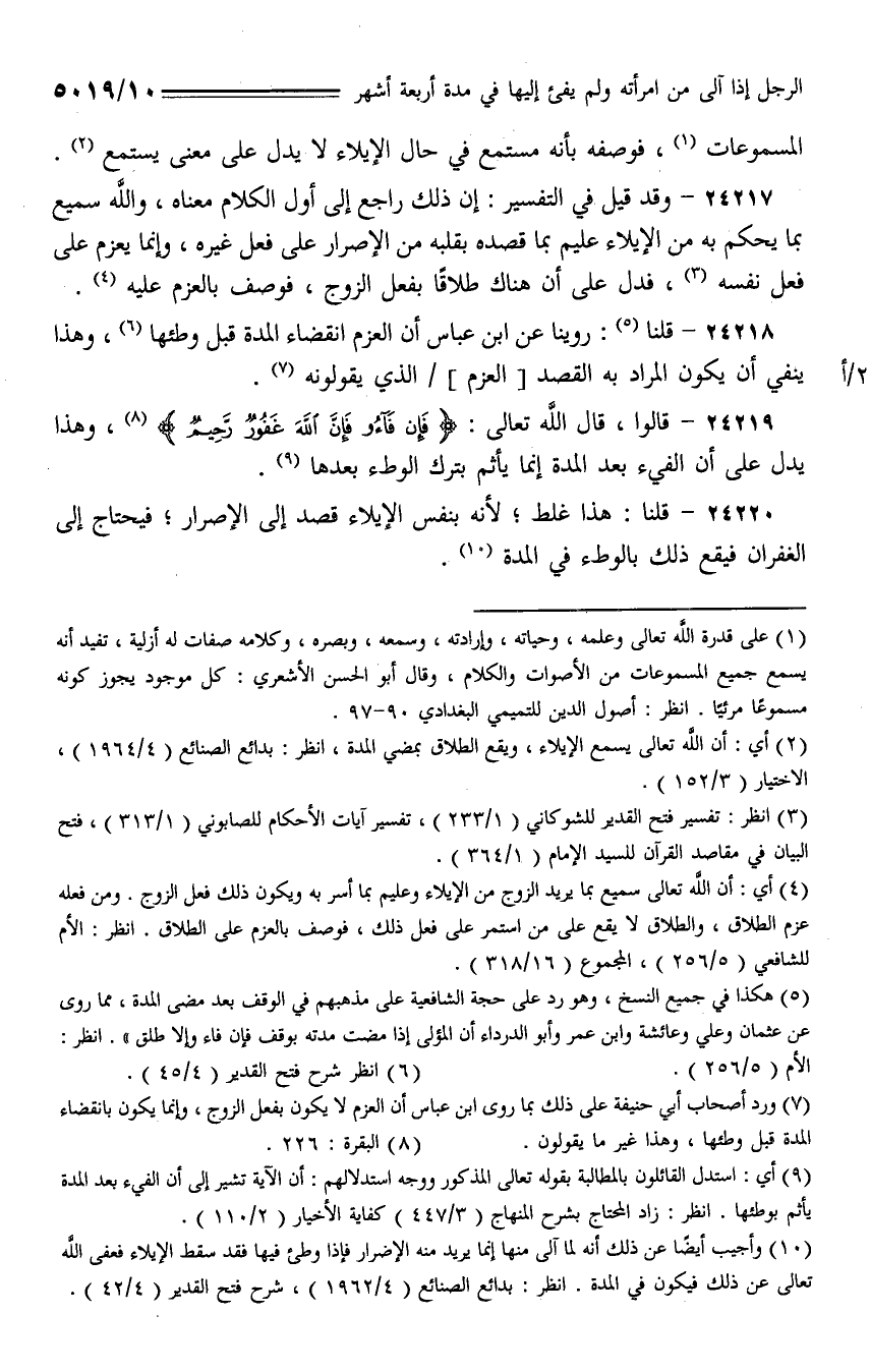 24217 - وقد قيل في التفسير: إن ذلك راجع إلى أول الكلام معناه، والله سميع بما يحكم به من الإيلاء عليم بما قصده بقلبه من الإصرار على فعل غيره، وإنما يعزم على فعل نفسه، فدل على أنه هناك طلاقًا بفعل الزوج، فوصف بالعزم عليه.