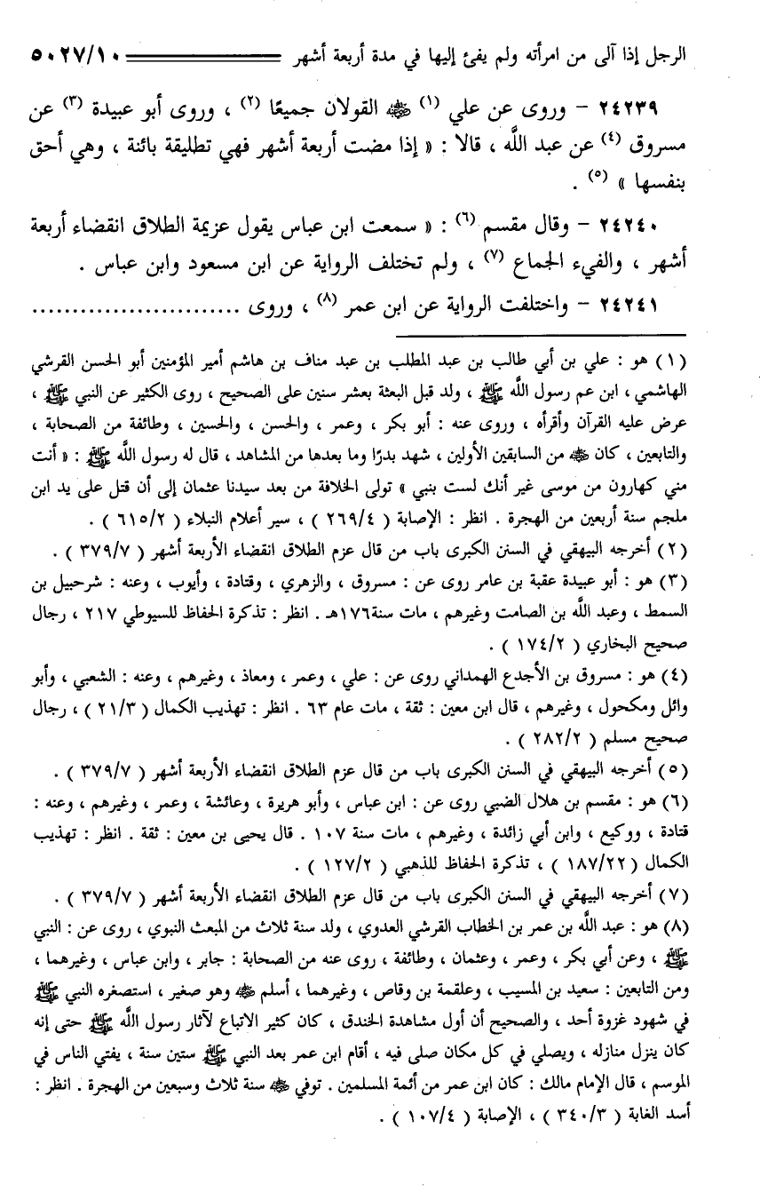 24239 - وروى عن علي - رضي الله عنه - القولان جميعًا، وروى أبو عبيدة عن مسروق عن عبد الله، قالا: (إذا مضت أربعة أشهر فهي تطليقة بائنة، وهي أحق بنفسها).