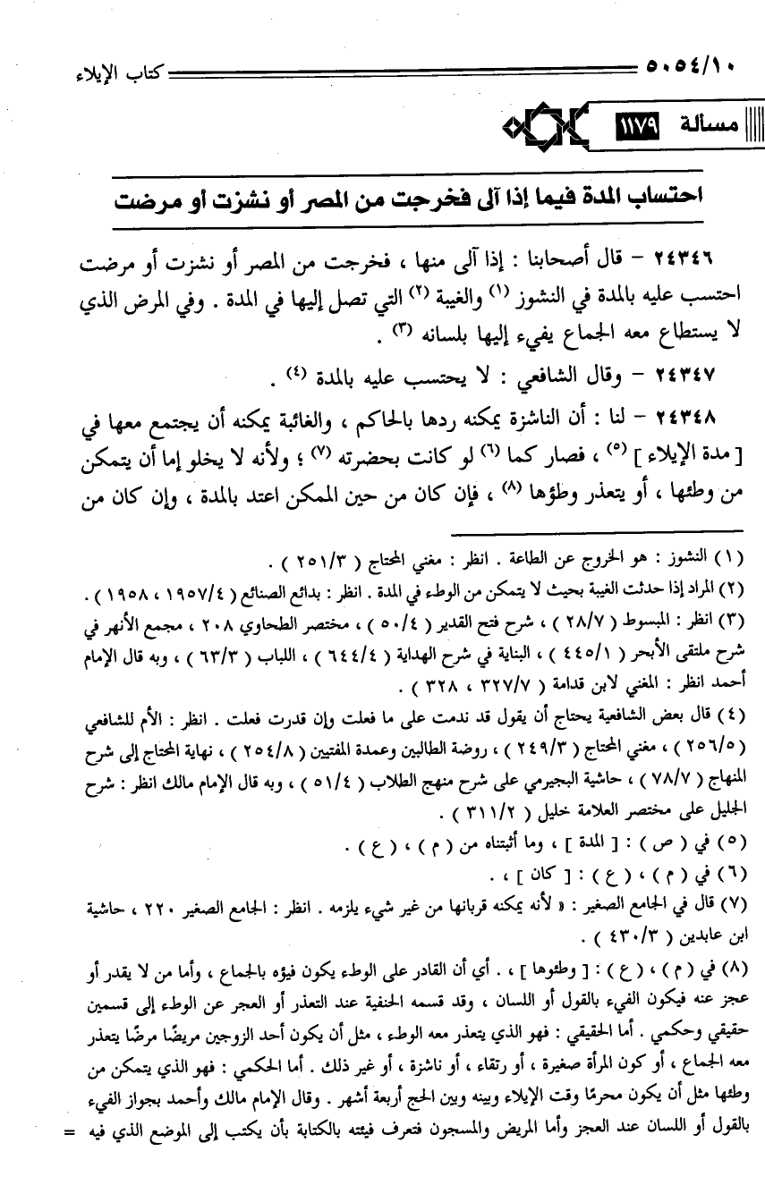24346 - قال أصحابنا: إذا آلى منها، فخرجت من المصر أو نشزت أو مرضت احتسب عليها بالمدة في النشوز والغيبة التي تصل إليها في المدة. وفي المرض الذي لا يستطاع معه الجماع يفيء إليها بلسانه.