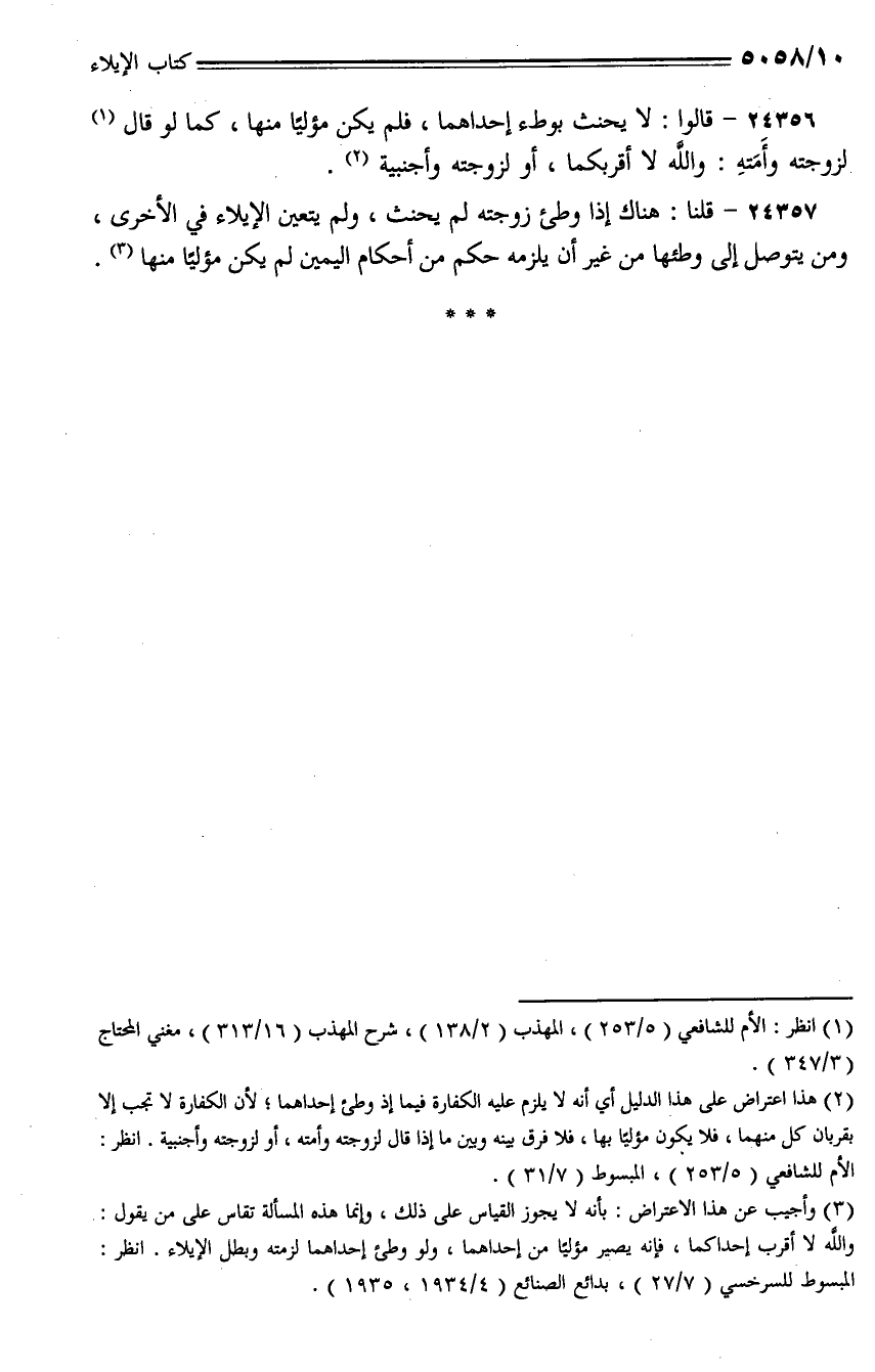 24356 - قالوا: لا يحنث بوطء إحداهما، فلم يكن مؤليًا منها، كما لو قال لزوجته وأمته: والله لا أقربكما، أو لزوجته أو أجنبية.