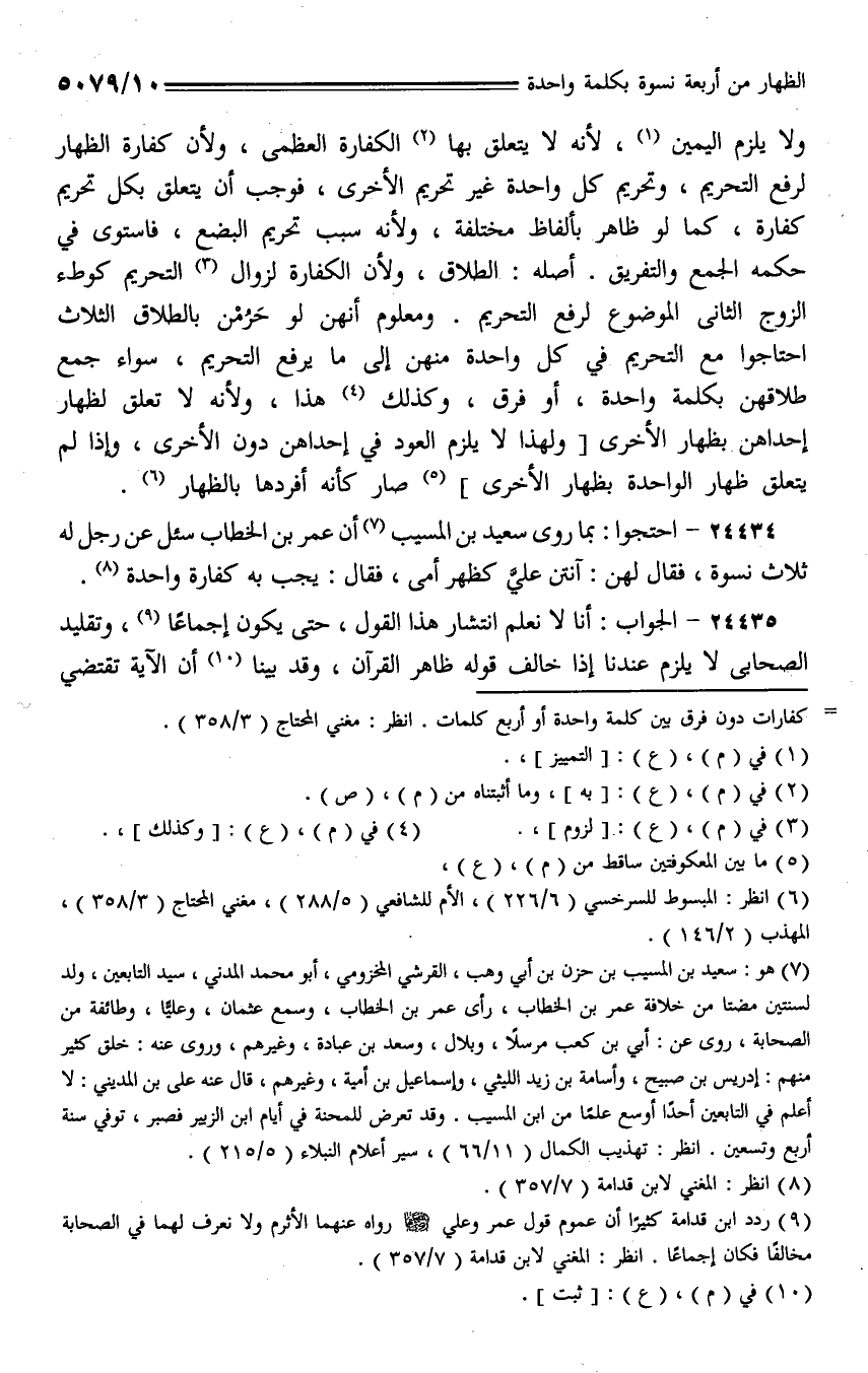 24434 - احتجوا: بما روى سعيد بن المسيب أن عمر بن الخطاب سئل عن رجل له ثلاث نسوة، فقال لهن: أنتن عليَّ كظهر أمي، فقال: يجب به كفارة واحدة.