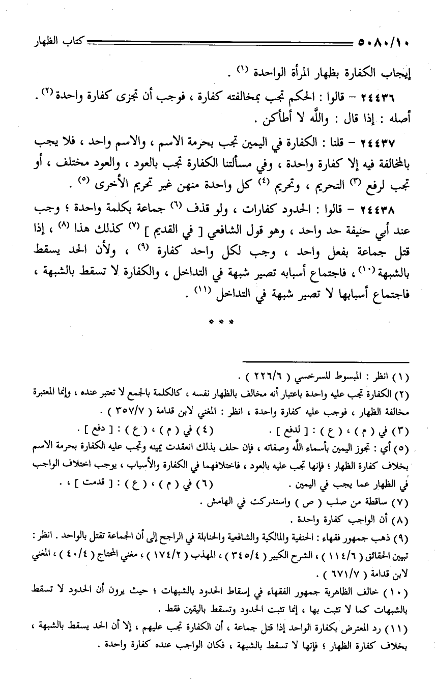 24436 - قالوا: الحكم تجب بمخالفته كفارة، فوجب أن تجزي كفارة واحدة. أصله: إذا قال: والله لا أطأكن.