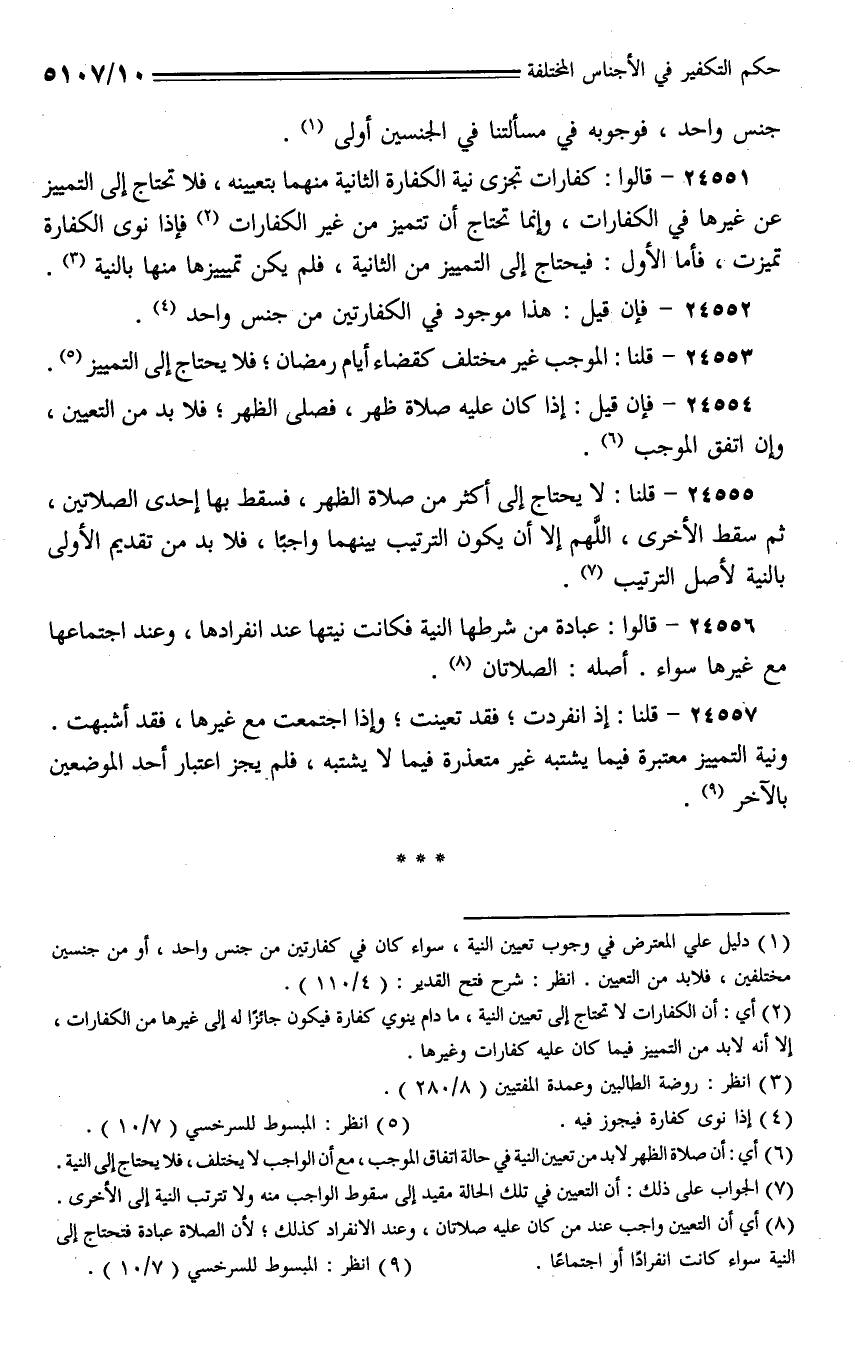 24551 - قالوا: كفارات تجزي نية الكفارة الثانية منهما بتعيينه، فلا تحتاج إلى التمييز عن غيرها في الكفارات، وإنما تحتاج أن تتميز من غير الكفارات فإذا نوى الكفارة تميزت، فأما الأول: فيحتاج إلى التمييز من الثانية، فلم يكن تمييزها منها بالنية.