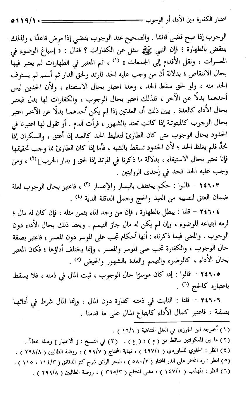 24604 - قلنا: يبطل بالطهارة، فإن من وجد الماء بثمن مثله، فإن كان له مال؛ لزمه ابتياعه للوضوء، وإن لم يكن له مال جاز التيمم. ويعتد ذلك بحال الأداء دون الوجوب. والمعنى فيما ذكرناه: أنها أحكام تجب على الموسر دون المعسر، فاعتبر بصفة حال الوجوب، والكفارة تجب على الموسر والمعسر، وإنما يختلف أداؤها؛ فكان المعتبر بحال الأداء، كالوضوء والتيمم والعدة بالشهور والحيض.