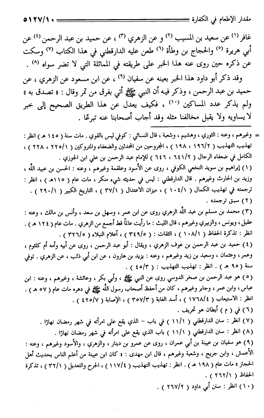 وقد ذكر أبو داود هذا الخبر بعينه عن سفيان، عن ابن مسعود عن الزهري، عن حميد بن عبد الرحمن، وذكر فيه أن النبي - صلى الله عليه وسلم - أتي بفرق من تمر وقال: (تصدق به) ولم يذكر عدد المساكين، فكيف يعدل عن هذا الطريق الصحيح إلى خبر لا يساويه ولا يقبل مخالفنا مثله وقد أجاب أصحابنا عنه تبرعًا.