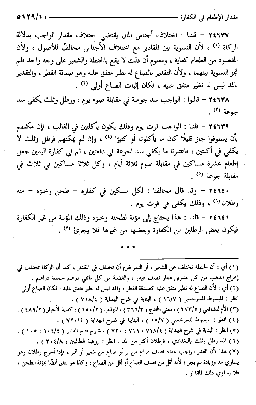 24637 - قلنا: اختلاف أجناس المال يقتضي اختلاف مقدار الواجب بدلالة الزكاة، لأن التسوية بين المقادير مع اختلاف الأجناس مخالف للأصول، ولأن المقصود من الطعام كفاية، ومعلوم أن ذلك لا يقع بالحنطة والشعير على وجه واحد فلم تجز التسوية بينهما، ولأن التقدير بالصاع له نظير متفق عليه وهو صدقة الفطر، والتقدير بالمد ليس له نظير متفق عليه، فكان إثبات الصاع أولى.